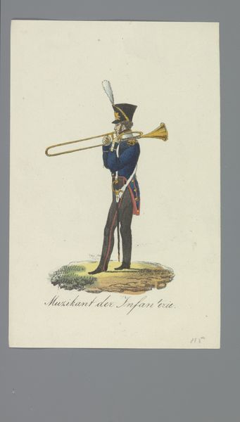 Albertus Verhoesen made this print of a militiaman, likely sometime in the mid-19th century, using etching and hand-colouring. The etching process involves coating a metal plate with a waxy, acid-resistant substance, then drawing through this coating to expose the metal. Acid is then applied to bite into the exposed lines, creating grooves that hold ink. This plate is then printed, transferring the image to paper. The application of watercolor adds vibrancy and realism. Consider the labour involved: from the initial preparation of the metal plate, the draughtsmanship of the design, the skilled application of acid, the careful inking and printing, and the final hand-colouring. Each stage demands time and expertise. In a pre-photographic age, such prints played a crucial role in disseminating visual information about military uniforms and civic duty. By focusing on the materiality and making of this print, we recognize the convergence of artistic skill, craft techniques, and social documentation, blurring the boundaries between art and historical record.