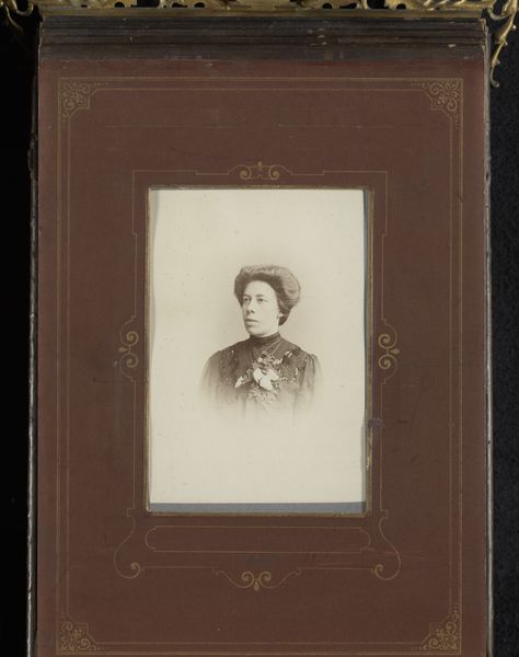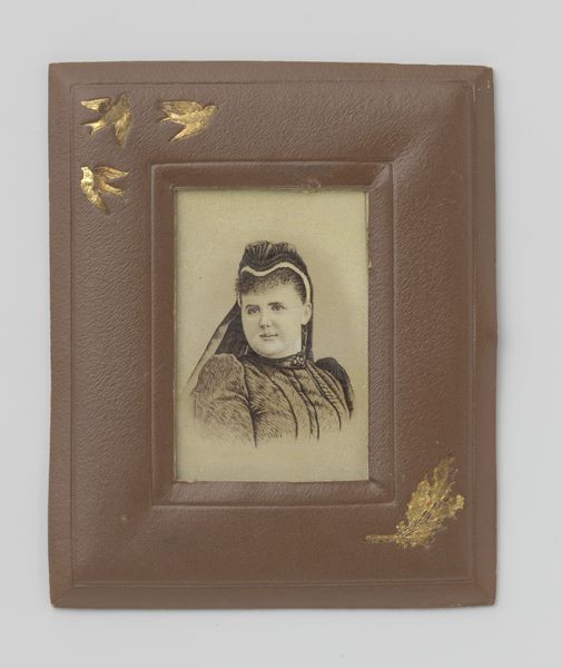 Editor: Here we have "Portrait of an Unknown Young Woman with Necklace," a photography albumen print potentially dating between 1855 and 1940 by John George Kirby. I find the overall composition quite compelling, especially the austere framing contrasting with the young woman's delicate features. How do you read the formal qualities of this image? Curator: The image is structured around a play of contrasts, wouldn't you agree? The geometric precision of the bordering patterns—the repeated angular motifs—is set against the smooth oval of the portrait itself. This framing both isolates and enhances the subject. The albumen print, a process renowned for its tonal range, lends a particular texture. Consider how the subtle gradations of light and shadow shape her profile. Do you find that this monochromatic palette informs the way you perceive her expression? Editor: Yes, definitely. The limited color range encourages a closer look at the subtle shifts in value. Her expression seems rather serious and perhaps even melancholy, but without the full range of color, it’s difficult to discern a clear emotional state. What does the direction of her gaze tell us? Curator: The averted gaze is pivotal. Rather than direct engagement, the subject’s attention is directed towards an off-screen space, prompting the viewer to fill in the narrative. The framing, coupled with this gaze, constructs a space that seems to be both present and elsewhere, tangible and symbolic. Do you note how the simple jewelry, a necklace, and modest earrings function? Editor: They introduce a tactile element, almost breaking the otherwise stark visual field, creating delicate patterns against the dark dress. I see that it encourages you to investigate the subject beyond the literal. Thank you! Curator: And you for providing an opportunity to re-examine the nuances of this portrait’s structure. It seems there’s always a detail waiting to be re-discovered in these complex formal relationships.