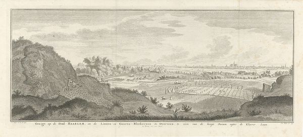 Curator: Before us hangs Pieter Nolpe’s "Landschap met boerderijen", a print using etching and engraving techniques that probably dates between 1623 and 1653. What's your first impression? Editor: It feels quite still, even peaceful, doesn't it? There's a lovely contrast between the detailed foreground and the soft, almost hazy distance. Curator: It reflects the Dutch Golden Age's burgeoning interest in realism and landscape as independent subjects. This piece gives insight into the Netherlands’ evolving sense of nationhood and civic pride during this period. The landscape itself becomes a symbol. Editor: Absolutely. Look at the subtle positioning of figures – their scale against the expansive land. They're small but significant, engaged in the daily life. Do you think Nolpe uses the water to mirror a sense of abundance in that era? Curator: Precisely. Waterways were the lifeblood of the Dutch Republic, vital for trade and defense. You often see them in landscape art of this time, reflecting the national prowess on both the land and sea. Editor: And the lone figure on the hilltop, gazing out – almost romantic in their isolation, what does that evoke to you? A pioneer’s contemplation, perhaps? Curator: Possibly. However, it might symbolize the aspirational middle-class landowner, a potent image for a society defining its identity beyond aristocratic land control. Notice, too, how the farmhouses clustered at the top could stand for new and existing centres of social power. Editor: That is interesting. Also, what is so striking to me about prints, is the way that, even in a simple etching, we receive powerful feelings of place, industry, even societal changes taking place within those serene hillsides. Nolpe captured the symbolism that makes that place eternal, wouldn't you say? Curator: Undoubtedly. Through his strategic design, Nolpe provides a compelling snapshot of Dutch ambition at a vital time in the country’s maturation. Editor: Thinking about Nolpe's placement, his symbols, he offers viewers more than just a scene; it really becomes a mirror of a culture in transformation. Curator: An evocative thought with which to leave our listeners!