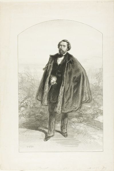 Editor: This is Paul Gavarni’s "Portrait of J. B. Isabey," a lithograph from 1858 currently held at the Minneapolis Institute of Art. There’s a wistful air about him, wouldn't you agree? Almost like a solitary figure contemplating a landscape… or perhaps a very important artistic decision. What strikes you about this piece? Curator: It makes me wonder what exactly was going through Isabey's mind that day! Was he pleased with his latest canvas or pondering which cravat best suited his aristocratic clientele? You see, Gavarni's genius lies not just in depicting Isabey's likeness, but in hinting at the inner world of a man known for his dazzling miniatures and courtly connections. It’s almost as if the stormy romantic landscape reflects something internal, some passionate intensity simmering beneath that formal attire, don’t you think? Editor: Definitely. I guess the landscape contributes to the overall mood of romanticism, juxtaposing against his formal attire...But how much can we infer of the individual from the external details, particularly in a lithograph from this period? Curator: Ah, a brilliant question! It's about playfully connecting the dots – Gavarni hinting, Isabey posing (perhaps a little self-consciously), and we viewers, weaving our own narrative threads. Perhaps we find a secret affinity there, that tension between outward presentation and inward complexity that continues to shape identity even now. Don't you feel it a bit? Editor: I see what you mean; it's a collaborative dance between artist, subject, and viewer. Thanks for highlighting those details. It makes this portrait feel less like a static image and more like a fleeting, intimate encounter. Curator: Exactly! And isn't that the magic of art?