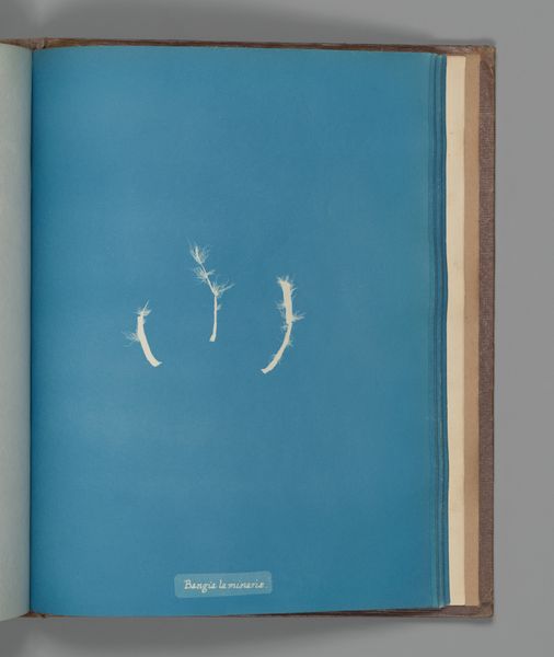 Curator: Welcome. We're standing before Anna Atkins' "Vaucheria caespitosa," a cyanotype from between 1851 and 1855. Editor: Striking, isn't it? The crisp white form against that intense blue. It’s ghostly, like an echo. It is surprisingly direct, considering its age. Curator: Indeed. Atkins was a botanist and photographer, and she created these cyanotypes to document British algae. Think about the accessibility she enabled: circulating scientific knowledge beyond established academic circles at the time. Editor: Right. And we must consider cyanotype as a chemical process. Exposing treated paper to sunlight - that’s a direct material intervention, using the sun’s energy to record the natural world. It flattens the plant into a photogram. Curator: Absolutely. This particular image represents "Vaucheria caespitosa," a type of algae. But the stark simplicity pushes against straightforward classification. Its visual impact goes beyond mere illustration. Editor: Beyond the pure beauty of it all: Imagine Atkins preparing the chemicals, coating the paper, carefully laying out the specimen, then patiently waiting for the sun to do its work. The labor involved, connecting art, science and craft. Curator: Precisely, these photographs existed because of larger cultural movements towards scientific education. Science became popular; think public lectures, the publishing of nature books for broader audiences... This photograph actively participated in those events. Editor: The politics of imagery and the hand. Even within what we deem ‘scientific,’ there is human input, which should be remembered. It serves not only as an index, but a portrait of the relationship. Curator: That’s a superb point. By harnessing the cyanotype, she bridged art and science but did so much more than documentary work, she engaged in contemporary debates on access to knowledge. Editor: Reflecting on Atkins’ dedication, what resonates is the careful interplay between nature, technique, and human intervention, offering a glimpse into her process and the world she sought to document.