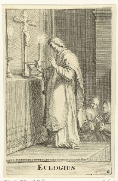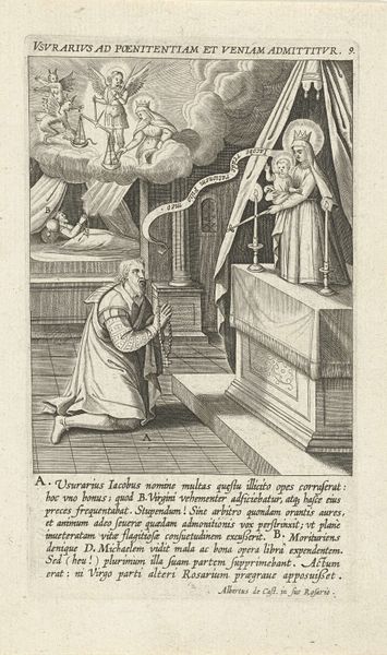 Curator: Here we have “Heilige Posidonius van Thebe” or "Saint Posidonius of Thebes," an engraving by Frederick Bloemaert made sometime after 1636. It currently resides here at the Rijksmuseum. The crispness of the engraved line gives it almost a photographic feel, despite its clear historical context. Editor: There's something so stark about the composition. It feels both reverent and deeply unsettling. I'm immediately drawn to the bizarre little dragon-like figure in the beam of light. What’s going on here? Curator: Well, let’s consider the materiality. As an engraving, it’s inherently reproducible. Bloemaert's choice of this medium would allow the story of Posidonius to be disseminated widely, making him accessible beyond an elite circle. I wonder what kind of workshop and apprenticeship informed his masterful use of line and burin? Editor: That beam of light…and the supplicant’s open hands. This visual motif screams divine intervention, or some sort of revelatory experience. It is compelling that this "dragon-like" creature would represent divine interaction for its historical context. Could this form be an allegory for some societal fear, given it’s accompanied by what looks to be a woman in her bedchamber and a vulnerable child? Curator: A fine observation about fear! Bloemaert's choice of engraving as a medium also speaks volumes. Think about the labour involved. The painstaking carving, the precision required... This isn't just an image; it's the product of hours upon hours of skilled labour intended to propagate the image for a potentially wide and receptive audience. Editor: The historical element adds an interesting layer. I can't help but consider how symbols of the sacred or divine change, morph, and are reinterpreted across time, shaped by societal anxieties. Posidonius Thebeus’ name itself invokes the antiquity of the Hellenic world. Curator: Precisely. And considering the original function and dissemination of the engraving is crucial too. It wasn't intended to hang in a gilded frame; it was designed for consumption, trade, and the transmission of stories about the figure. A mass producible emblem of its era and social context, quite distinct from say, an oil painting. Editor: It all circles back to the power of imagery. Frederick Bloemaert's visual language serves not just as a story but, as you highlight, encapsulates social constructs about access and power. Thinking about art in this way just deepens our appreciation of their history and enduring relevance, doesn't it? Curator: Indeed. Examining the artwork as a product as well as an image allows us to consider both labour and lore in ways that are so frequently overlooked.