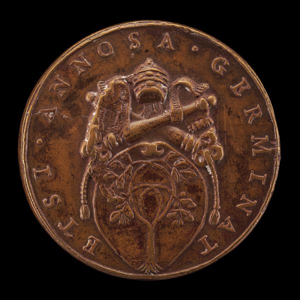 Editor: So this is a bronze medal portraying Paul III, created by Leone Leoni in 1538. I find it remarkable how such a small object captures so much detail. How do you read this piece? Curator: This medal presents an interesting study in hierarchical representation. Observe how the composition centers on the profile of Pope Paul III. Note the deliberate choice of bronze as a medium; its inherent qualities – durability and reflective capacity – contribute to the overall effect of permanence and power. Consider also the circular format, which reinforces a sense of wholeness and completion, conceptually aligning the pontiff with ideals of universal authority. Editor: That's insightful. I hadn’t thought about the circle contributing to that sense of authority. Does the lettering around the edge contribute? Curator: Indeed. The inscription, rendered in precise lettering, frames the central image. The letters themselves form a visual pattern, but more importantly, they circumscribe the Pope's identity, serving as a constant reiteration of his power and his connection to a classical ideal. Editor: Are you saying that the inscription is as important as the portrait? Curator: Functionally, perhaps. Consider their relationship. The lettering sets up the frame and context of this object as a representation of power. Within it, the artistic skill reveals a tension between likeness and symbolic value through textures, color, shape and material. Editor: This has definitely changed how I see it. Thanks! Curator: My pleasure. By understanding these intrinsic visual components, we reveal deeper meanings within the artwork.