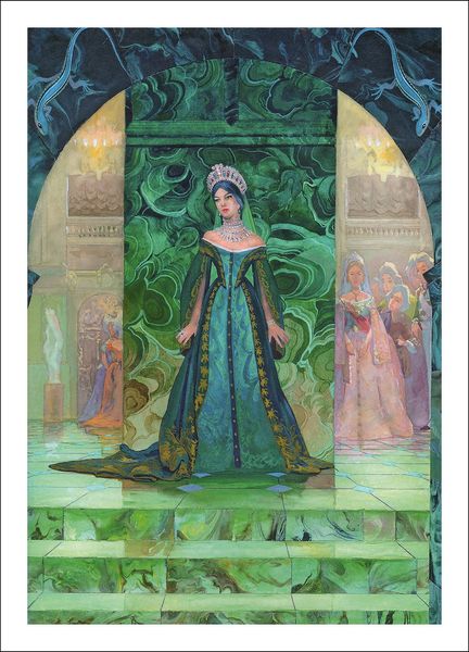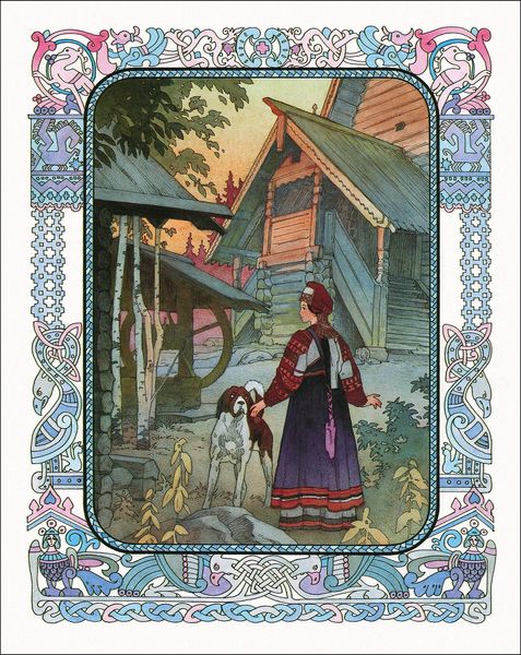 This illustration for The Tale of the Dead Princess and the Seven Knights appears to be made with watercolor and ink, and the lines are so precise, so sure. It’s clear that artmaking is a process, a story told one careful mark at a time. The colors are muted, like looking through a dream, but the details are sharp. The patterns on the princess’s dress, the wood grain of the walls, and that strange scene glimpsed through the doorway are all rendered with amazing care. I keep coming back to that doorway. What’s going on out there? A ghostly figure, a dog, a sense of unease. It’s like a visual metaphor for the story itself, a glimpse into a world of fairy tales and danger. There’s something of Ivan Bilibin in the intricate borders, but Nazaruk’s style feels more personal, more vulnerable. Art is like a conversation, a passing of ideas from one artist to another, each adding their own voice to the chorus. This piece is all about embracing the ambiguous, leaving space for each of us to find our own story within the image.
