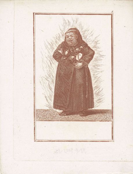 Jacob Gole created this print, "Slapende Monnik," sometime between 1660 and 1737. The image presents us with a monk dozing in his chair, a small note clutched in his hands, and a peculiar object affixed to his headwear. This medallion is reminiscent of those worn by pilgrims, suggesting a journey or a quest, perhaps for spiritual understanding, now interrupted by slumber. The motif of sleep has long been a powerful symbol in art. Consider the Roman god Somnus or the many depictions of the sleeping Ariadne—figures whose rest is laden with profound emotional and psychological weight. Sleep, here, might represent a retreat from worldly concerns or a moment of vulnerability. The monk's slumber, however, is far from peaceful. There is a sense of unease, hinting at the tensions between spiritual aspiration and human frailty. Note how, over time, the idea of sleep has shifted from a divine gift to a sign of human failing, reflecting our complex and often contradictory attitudes toward rest and activity. This echoes through ages, reminding us of the cyclical nature of symbols and their enduring power to engage our deepest emotions.
