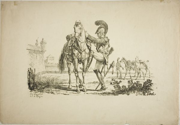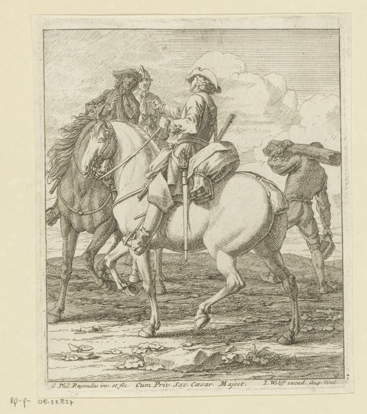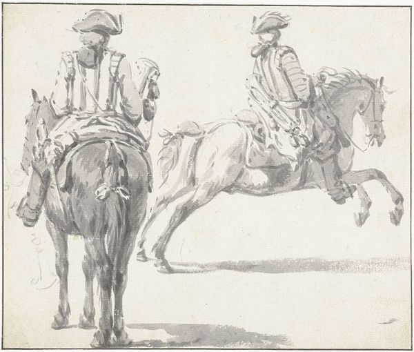 Curator: Philips Wouwerman created this drawing, “A Mounted Grey Horse Being Schooled in Piaffe,” sometime between 1646 and 1668. It's currently held at the Metropolitan Museum of Art. The technique is really stunning—it’s rendered in ink, pencil, and wash. Editor: The energy of the horse is what really strikes me. Despite the monochrome palette, you feel its power and tension. The posture of both the rider and the animal are charged, the anticipation is palpable. Curator: Absolutely. And considering Wouwerman’s socio-economic position, his access to the equestrian world and the leisure activities of the wealthy opens a fascinating dialogue. We have to acknowledge his place within systems of privilege that were inherently exclusive and hierarchical. It’s impossible to separate this depiction of equestrian training from its context of class and power. The performative and practiced artifice in which wealth manifests through access and ability. Editor: Yes, precisely. It reminds us that art often serves to reinforce existing power structures, especially regarding patronage and audience, however there is still so much to appreciate technically about his draftsmanship, his portrayal of Dutch Golden Age realism that it makes the image quite interesting, if complex in that relationship between viewer and patronage as the means through which the art even comes to be. Look how he captured the subtle textures of the horse's coat. Wouwerman used fine lines and shading to achieve volume and depth, the piaffe requiring not only technique for the rider, but also the horse to build the core muscle required. There's a kind of beauty there that isn't intrinsically linked to politics, per se, even though its environment enables its execution. Curator: That’s a really valid point and something that is crucial to unpack; we're dealing with a nuanced relationship. How do we appreciate artistic skill and craftsmanship without erasing the fact that these representations are embedded in complex social dynamics and that there are complex histories when concerning equestrian ownership and power. To whom is that access granted and afforded to, historically and in the present? Editor: Precisely, and this drawing becomes a point of entry into examining those power structures and the evolution of these practices—which continue into modern life as luxury displays through both the animal's power and the social rank and role to the privileged equestrian practitioner. It is also interesting to wonder what art pieces might look like should the narratives shift toward a dismantling of power structures concerning gender, wealth and animal use, the questions art must now navigate to forge a path ahead. Curator: I appreciate how our conversation highlights these intertwined dynamics, enriching our understanding of Wouwerman’s drawing beyond the surface level and the means of access, its narrative role beyond even our two voices this moment, creating greater dimension in conversation with all, as an educational conduit.