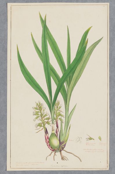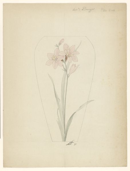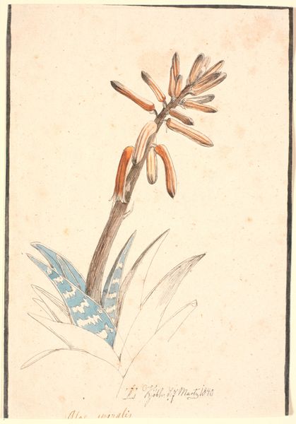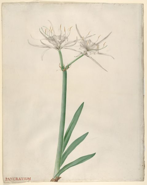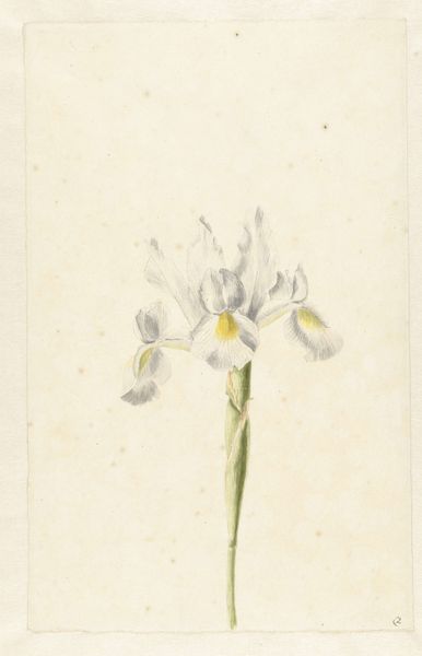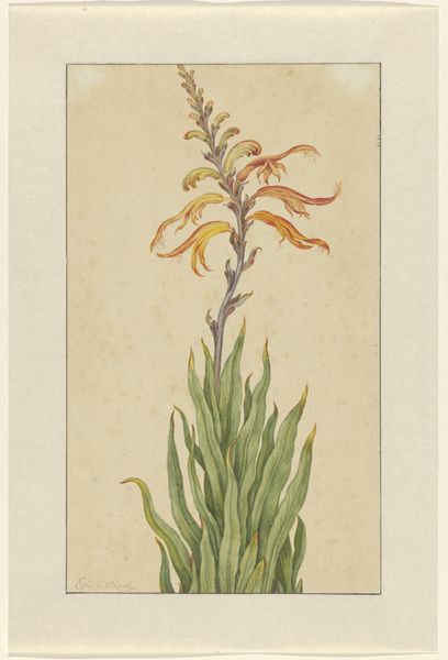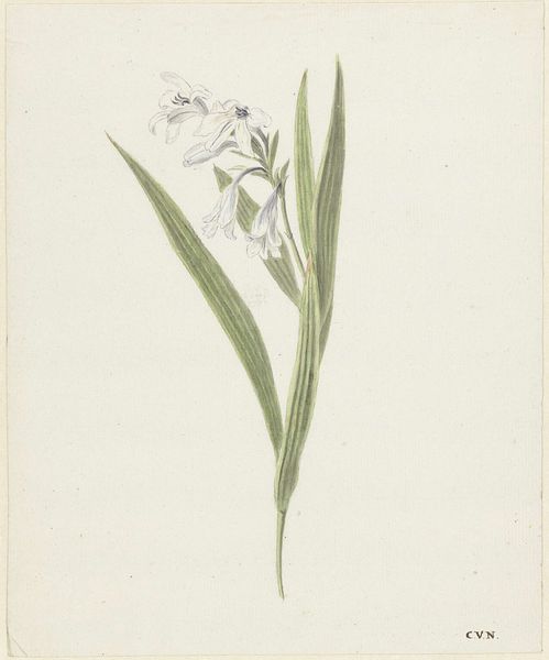 Curator: Vincent Jansz. van der Vinne rendered this study of a hyacinth in watercolor and drawing on paper. It’s thought to have been completed somewhere between 1746 and 1811. Editor: It strikes me as incredibly delicate; the artist seems almost hesitant to touch the paper, employing the watercolor with utmost care. Curator: Van der Vinne clearly delights in capturing the details of the natural world. The line work here is particularly precise, delineating each tiny bell-shaped floret. In floriography, the hyacinth is associated with playfulness, beauty, and sometimes even regret. I wonder if those meanings were on his mind? Editor: Meaning aside, the composition is quite striking. The negative space really accentuates the subtle curvature of the stem and the leaves; notice how they almost frame the cascade of the blossoms. It's a masterful use of the white ground, wouldn't you say? Curator: Yes, the whiteness draws you into the form. The upward reach and the downturned petals contrast with the more relaxed flow of the leaves. Van der Vinne likely sought to portray nature faithfully, yet one could read this bloom as emblematic of nature's grace. Perhaps these forms offered some solace during a challenging time. The Hyacinth has complex symbolism in art. Editor: I see your point, and while symbolism adds layers, I'm more compelled by how these muted colors—pale yellows and soft reds—create such a serene and inviting experience, no? The overall effect is quiet contemplation. It truly shows what can be done with limited tones and hues, making us value the power of reduction. Curator: Looking closely, one realizes just how attentive Van der Vinne was, revealing through his art not only beauty but also an unspoken narrative. The language of flowers, if you will. Editor: Ultimately, what this work demonstrates is the enduring impact of art when close formal observation combines so expertly with emotional investment.