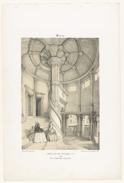 Editor: Here we have John Carter's "Lea Castle, View in the Library, Looking East," created sometime between 1811 and 1821 using pencil, print, and etching. There's something so captivating about its understated nature, almost like a personal glimpse into a private space. What draws your eye when you look at it? Curator: The architectonic structure is most compelling. Note the intricate vaulting of the ceiling, and how it echoes the arched windows and fireplace. The linearity in the bookshelves and the figure at the desk create a series of receding planes, composing depth and spatial tension within the composition. Do you see how the light source, seemingly from the windows on the left, sculpts the forms, further emphasizing the architectural elements? Editor: Yes, I see that now, how the light interacts to create definition. But I am curious about the globe in the composition - a statement piece that is almost at the centre of the painting - does this serve more than compositional intention? Curator: It is less about subject matter and more about how those forms contribute to the overall structure of the artwork. The curve of the globe perhaps mimics that of the arches in the architecture and pulls forward the plane that includes the portrait above the mantle place. Are you noticing any relationships between those forms, and how the artist carefully renders them? Editor: I think I am beginning to! Focusing on the interplay of form, light, and the receding planes of the architecture has offered a deeper appreciation beyond my initial reaction to its understated quality. Curator: Indeed, sometimes, what isn't immediately apparent holds the most significant insights. It has encouraged a reevaluation of what is present beyond the presented subject.
