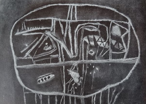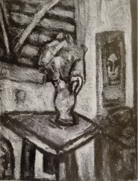 Editor: We are looking at "Czobel Bela Dinnyés Csendélet," a charcoal drawing by Bela Czobel. There isn't a precise date associated with it. What strikes me is the bold use of shading to create depth; it feels like the objects are emerging from a dense fog. What do you see in this piece? Curator: The immediate presence of the charcoal—its texture and application—dictates our reading. Notice the contrast, not in terms of colour, as it’s absent, but of tonal value. Observe how Czobel manipulates light and shadow to delineate forms. Are these forms mimetic? Editor: They're somewhat recognizable as a still life: perhaps a bottle, some fruit… but they’re definitely distorted. Is that distortion part of Expressionism? Curator: The distorted forms indeed resonate with Expressionist principles, rejecting a purely representational mode. It encourages us to investigate the relationships between forms, lines and masses, irrespective of external reference. Can you trace how the composition directs your eye? Editor: My eye definitely jumps around! The strong diagonal of what appears to be a bottle immediately pulls me in, but then it loses its shape and blends with the background. I’m not sure where to rest my gaze. Curator: Precisely! That tension between structure and dissolution is what's most compelling. There is a dynamic visual field, not easily resolved into conventional order. It challenges the viewer to create meaning from its very construction. Editor: That’s a helpful way to put it. I appreciate you showing me that even without obvious cultural references, the elements of the piece themselves communicate something powerful about form and fragmentation. Curator: Indeed. And remember, our perception of such structural dynamics is equally critical to understanding any artwork's enduring impact.
