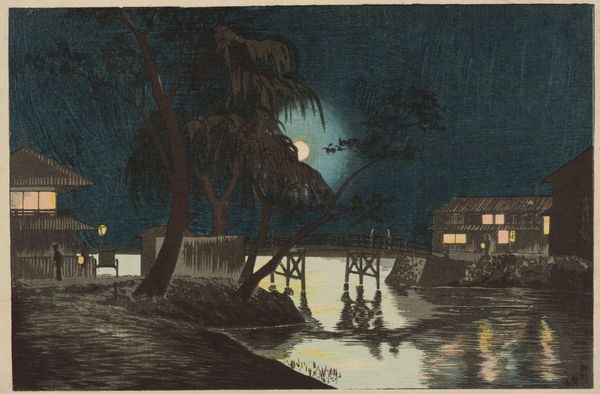 Editor: So, this woodblock print is titled "Beach Shed at Himi in Etchū Province," created by Hasui Kawase in 1921. There’s a certain quietness to it, a gentle rhythm of life by the sea. The solitary figure with the umbrella brings such focus to the scene. How do you read this work? Curator: The umbrella, a floating sun, amidst a potentially brewing storm…notice how it reflects a longing for protection, perhaps even a naive hope in the face of nature’s raw power. Does the island in the background remind you of anything? The misty mountains of classical Chinese painting, perhaps? These motifs are not just visual elements, they carry a collective memory of cultural archetypes—tranquility, but also the ephemerality of existence. Editor: I hadn't thought about that! The island *does* feel almost like a mirage now that you mention it. And is that a suggestion of rain in the sky? Curator: Precisely. Look at how the artist utilizes the watercolours to reflect light in the humid air, in a moment pregnant with potential… the storm and clarity co-existing as two faces of the same experience, just like the bittersweet acceptance within Ukiyo-e art traditions. Perhaps even hinting at anxieties within modern Japan's relationship to rapid westernization, juxtaposed against unchanging aspects of coastal life. Does that idea resonate? Editor: It absolutely does. It makes me think about how symbols can evolve to take on new meanings, even though they still retain some of their original context. Curator: Indeed! The continuity lies not in literal repetition, but in resonance across cultural memory. And that shared recognition shapes both art and the viewers’ ever-shifting psychology. Editor: I see the composition in a completely different light now! Thanks. Curator: A true dialogue shifts the lens, doesn't it?