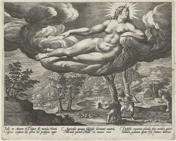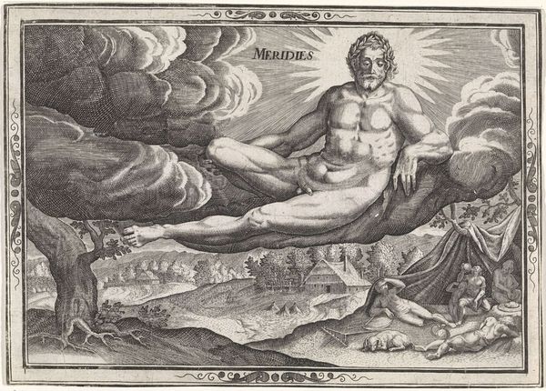 This engraving, "Middag," was made by Johann Sadeler I in 1582. Dominating the scene is a reclining, nude male figure wearing a laurel wreath, an emblem of victory and status since ancient times. Sunlight radiates from his body, identifying him as a personification of midday, or perhaps even Apollo, the sun god of classical antiquity. This motif of the sun god has roots that reach back to ancient Greece and Rome, where Apollo was celebrated for bringing light and order. Yet, here, this classical figure is recontextualized in a 16th-century landscape, complete with laborers resting from their toil. The motif of a classical god overseeing earthly activity appears time and again through history, a testament to the endurance of classical ideals. Such depictions speak to a collective memory, where symbols of power and divinity resurface. The emotional impact of this image lies in the subconscious recognition of these symbols. They connect viewers to a heritage of cultural and religious ideas, subtly influencing our perception of power. The sun, the laurel wreath, and the human form itself become conduits of meaning, echoing through the ages. They evolve, adapt, yet retain a core essence.
