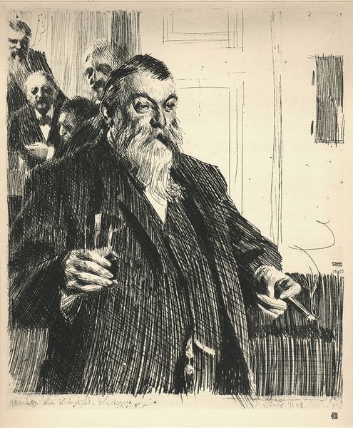 Editor: Anders Zorn’s etching, "A Toast II", from 1893… there’s something wonderfully convivial about it, though rendered in stark blacks and whites. I love the density of the lines, but it still feels airy and light somehow. How would you interpret a piece like this? Curator: It does breathe, doesn't it? It’s as if Zorn captured not just a moment, but the whole mood of a gathering – the clinking glasses, the smoke hanging in the air… etched in time. Notice how the main figure is so robust, present; compare this to the half figures in the background; are they ghosts? Memories? Zorn’s working both inside and outside of what’s present. Have you ever felt the energy of a great party humming in the air like that? Editor: I think so. The feeling that something big has already happened or is about to. So you're saying Zorn captured that anticipation? Curator: Precisely. The work lives in this liminal space; what's done, what will come to pass; it feels deeply personal and fleeting, just like the sensation of nostalgia itself. Zorn plays with line and form to evoke those sensations. The cigar smoke, for example – it is almost a line from his pen, continuing the medium into the world of the subject. Editor: That's amazing, I hadn't considered the layers of temporality and the blurring of lines between the art and the art world in the frame. I see so much more than a snapshot of some people raising a glass. Curator: I agree, art holds that potential. Zorn has gifted us something deeply personal, masked with an almost public presentation. Editor: Well, now I see Zorn didn't just capture a toast; he bottled a feeling, which can’t be a simple task. Thanks for illuminating that. Curator: My pleasure; may this "toast" live beyond us all.
