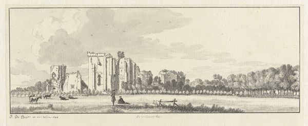 Curator: This is John Baptist Malchair's "Godstow Abbey." Editor: It feels incredibly serene, almost like a faded memory. The light is amazing, isn't it? Curator: Indeed. Malchair, active in the late 18th and early 19th centuries, was fascinated by the picturesque. Notice how the engraving captures the social and economic landscape. Editor: It's that little boat gliding on the water that gets me. It gives the whole scene a sense of movement and purpose. Curator: Precisely. The abbey ruins become a backdrop to everyday life, agriculture, and transportation. Consider the materiality of the tools, the labor of the farmers. Editor: I love how the textures are rendered. It's delicate, but sturdy. I'd love to know the story of that boat! Curator: It's a visual record of the human impact on a landscape. Editor: For me, this image is all about finding beauty in the mundane. Curator: An interesting observation. Editor: It really invites you into a quieter space, doesn't it? Curator: It is a nice moment to reflect, I suppose.