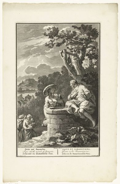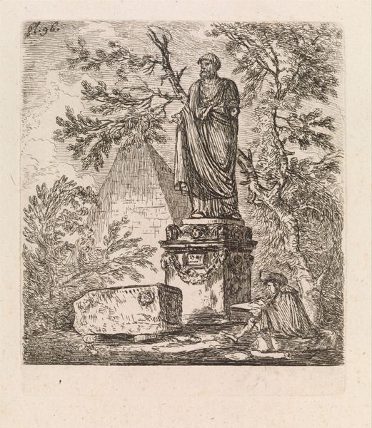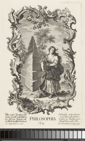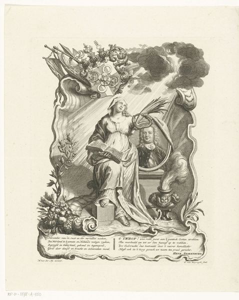 This etching titled, 'Vignet met allegorie met symbolen van overvloed en vergankelijkheid,' was created by Leendert Brasser in the 18th century. The composition invites the viewer to a symbolic landscape framed by an ornate border. Within this tableau, the allegorical figure reclines, seemingly at ease amidst symbols rife with meaning. To her right, a beehive teems with activity, representing industry and abundance. This contrasts sharply with the foreground where a skull, hourglass, and scythe lie—emblems of mortality and the fleeting nature of time. The artist creates a visual tension between prosperity and transience. The detailed etching work enhances these dichotomies; the delicate lines illustrating both the vibrancy of life and the stark reminder of death. Brasser utilizes a semiotic system of objects that prompt reflection on earthly pleasures versus inevitable decay. It is a commentary on the human condition, framed beautifully in a vignette of visual and philosophical depth.