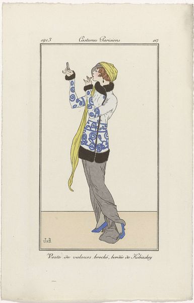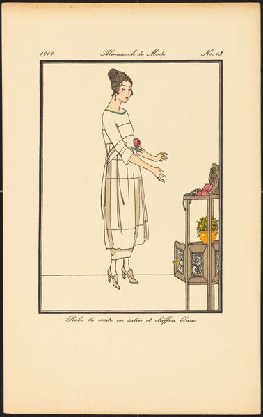 Curator: This elegant mixed-media print is entitled "Gazette du Bon Ton, 1914 - No. 6, p. IX: Advertentie Helena Rubinstein" by E. Ayres. Editor: It's strikingly sparse, almost minimalist, yet with an underlying art nouveau flourish. A definite sense of commercial chic with those elegant, flowing lines. Curator: Precisely. Placed within the Gazette du Bon Ton, this image highlights the convergence of fashion, art, and early advertising in a period of burgeoning consumer culture. The materiality of ink, paper, and the print process allowed for wide distribution. The repetitive linear details imitate woven textiles and reference industrial modes of production of fabrics in Paris. Editor: I see what you mean about production and dissemination shaping visual style. Ayres leverages the accessibility of print media to broadcast a message of aspirational beauty tied to specific products and locations, like the addresses listed below Helena Rubinstein’s name. The text itself reads “scientific culture of beauty thanks to ‘Valaze’ products.” Curator: And it signals a fascinating historical shift. We see beauty positioned not just as inherent, but as attainable through 'scientific culture' and consumption. The institution of beauty moves away from organic methods to a place of technological advancements which also parallels labor practices during the Industrial Revolution. Editor: Interesting. I tend to see it more as a portrait of marketing at a transitional time, between handcrafted ideals and mass consumerism. The beauty products themselves are presented more symbolically than realistically, as commodities mediated by line and textual inscription. It all contributes to the myth of attainable Parisian beauty. Curator: I agree there's definitely a dialogue happening in the transition from handcraft ideals to mass-produced consumables through art. However, seeing how artists worked as the first advertising firms speaks volumes for how material and labor intertwine in early advertising. Editor: On the whole, viewing it through these different lenses underscores the enduring power of visual culture and advertising to shape societal values. Curator: Absolutely. Analyzing the work reminds us of advertising’s profound effect on everyday objects, imbuing our perceptions of consumption, fashion, and even of our selves.