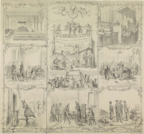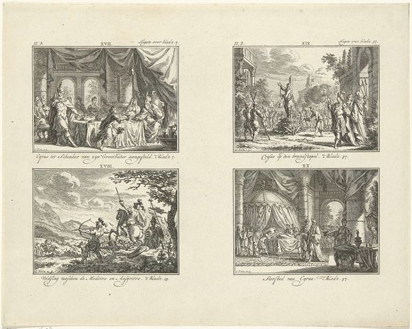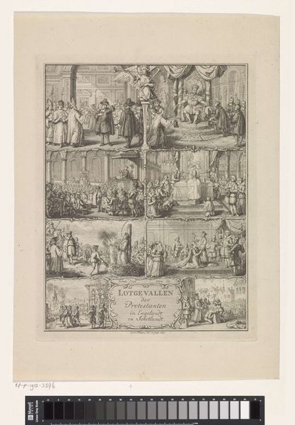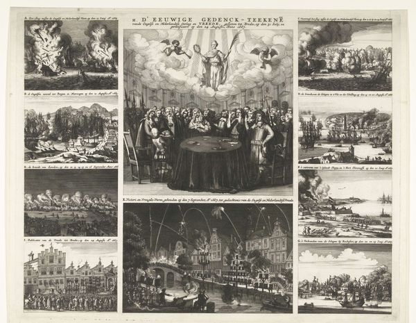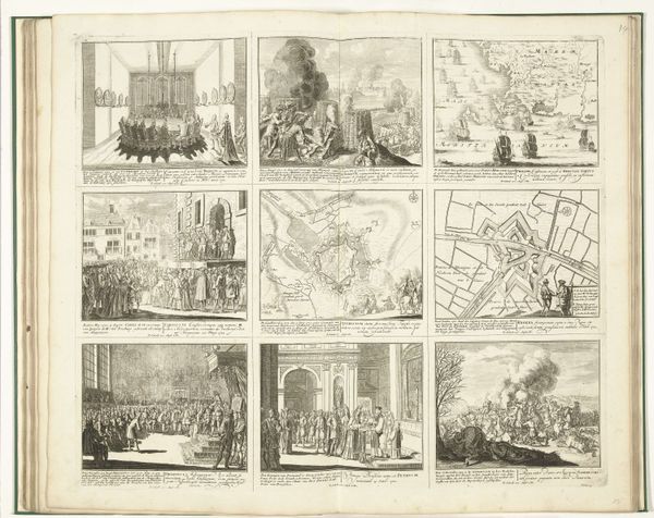 Leonard Schenk created this print in 1721, titling it ‘Theatre of War, plate XXII’. It depicts the stages of the Treaty of Nijmegen, the conclusion of the Franco-Dutch war. The image creates meaning through visual codes typical of its time, presenting nine scenes which show the peace process. These range from military displays to diplomatic negotiations and the formal signing of the treaty. Made in the Netherlands, the print reflects the Dutch Republic's central role in European politics at the time. The war had a profound impact on Dutch society, influencing its economy, political alliances, and cultural identity. Prints like this served a crucial public role, disseminating news and shaping public opinion about significant events. The Rijksmuseum holds a wealth of such images, providing historians with valuable resources for understanding the social and institutional contexts that shaped artistic production and reception in the past. These sources reveal how art both reflected and influenced social norms.