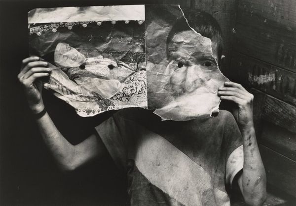 Editor: So, here we have Nathan Lerner's 1976 photograph, "The Shopping Bag." It's a black and white portrait, and it feels rather unsettling to me. I am struck by the way the eyes on the bag meet your gaze. What do you see in this piece? Curator: Well, I am interested in how the gaze functions symbolically. Those eyes on the bag, confronting us, echo ancient protective symbols, like the Eye of Horus. Eyes have always held a powerful place in the human psyche, representing vigilance, awareness, and even the soul. What do you make of the Japanese text on the bag? Editor: I'm not sure, but could the eyes, combined with the text, create a kind of mask? Curator: Exactly! This could evoke ideas of identity in the modern world and concealment, perhaps even the loss of individuality within consumer culture. It challenges the viewer, doesn't it? Think about how the bag transforms the person holding it into a walking advertisement or symbol. Editor: I guess it does become a statement. Curator: A statement about what we consume and how that consumption, in turn, defines us. And what is interesting about this conceptual framework to street photography? Editor: Well, seeing it that way really shifts my perspective! It's not just a random snapshot; it's a commentary. I will be looking at eyes in art differently now. Curator: It seems Lerner prompts us to question the subconscious impact of everyday imagery. Considering the context behind street-art in the '70s, a reflection of Japanese culture within Western society, is no small topic.