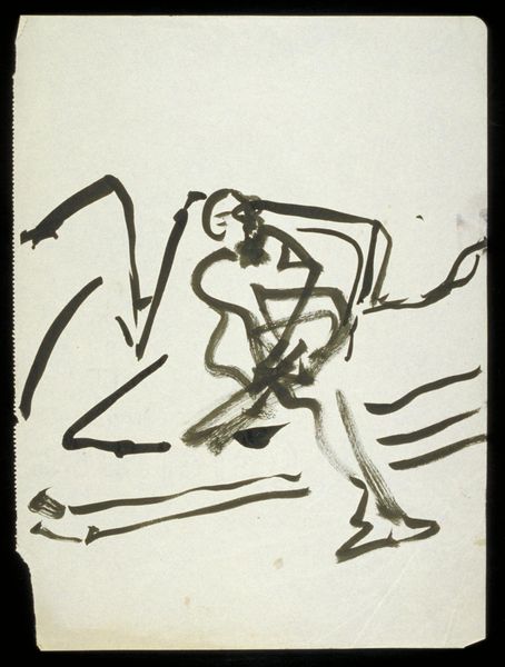 Curator: Let’s consider this sketch, "Vrouw met emmer op een ladder," or "Woman with bucket on a ladder" by Hans Borrebach. We know it was made sometime before 1954 and it’s rendered in ink and what appears to be light washes on paper. What's your immediate response to this image? Editor: My first impression is one of quiet domesticity tinged with a certain sense of melancholy. The woman, caught mid-action on the ladder, looks both capable and a little isolated. Curator: I find myself drawn to the interplay of line and form. Note how the artist uses confident, almost architectural strokes to delineate the figure against the white space of the page. The lines possess a rhythm, a balance. The slight use of color also defines the forms as well as offers structure to the composition. Editor: Yes, but to focus only on the formal qualities feels like ignoring the story it tells. Here we have a working woman, performing what seems like a mundane task, which perhaps raises questions about labor, gender roles, and the narratives we often overlook. The added text at the bottom even speaks to this as well, further placing her into a very direct action. Curator: Perhaps. But isn’t it possible to appreciate the dynamic tension within the composition itself? The upward thrust of the ladder countered by the downward cascade of water. This establishes a pictorial harmony independent of its socio-political implications. Editor: But art is never truly independent, is it? This work exists within a context. Borrebach was working in a time of immense social change. To ignore the potential commentary, whether intentional or not, feels reductive. It may have a certain formal appeal, yes, but understanding the broader conversations of that time adds depth to our reading. Curator: I appreciate the reading, but for me, it begins and ends with the effective and structured arrangement of space, line, and tone to offer its strength. Editor: And for me, the arrangement serves the story of the forgotten individual within shifting cultural sands. We've each taken something from the piece, highlighting the subjectivity of engaging with art and encouraging visitors to think beyond conventional methods.