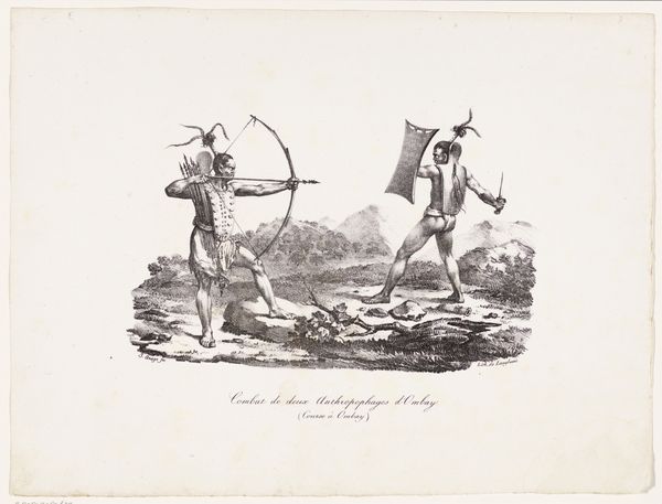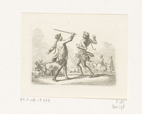 Curator: Here we have Daniel Nikolaus Chodowiecki's 1776 engraving, "Hoe een eerlijk man zijn straf incasseert," which translates to "How an honest man receives his punishment." It's currently held in the Rijksmuseum collection. Editor: The overall mood strikes me as quietly devastating. The precise lines capture a moment of undeniable humiliation. The composition is stark. It is drawing the viewers' attention towards this isolated exchange. Curator: Note the precision of Chodowiecki's etching technique. The delicate lines, built up through meticulous cross-hatching, define the figures and their environment. We can discern the textures of their clothing and the subtle contours of the landscape through these marks. Editor: Indeed, the technique itself is compelling. However, what stands out to me is how Chodowiecki uses this formal precision to depict a very specific societal ill – the public shaming of an individual by state-sanctioned authority. This echoes the political climate of the late 18th century. Curator: We might also read the figures symbolically. Consider the upright posture of the punished man. Notice that he still exudes a sense of dignity, contrasting the aggression shown by the figure with the raised sword. There's a palpable tension between order and resistance rendered beautifully by the line work. Editor: And this tension, of course, plays into the larger narrative of power, social control, and the individual. The man's "honesty," as the title suggests, directly challenges those structures. The crowd of onlookers further amplifies this dynamic, becoming silent witnesses, accomplices in his degradation. Curator: It is quite remarkable how such a small print – just a few inches in either dimension – can encapsulate such weighty themes with such precision. It is the balance of visual elements, its contrasts of dark and light, form, and posture, that lend it a profound sense of consequence. Editor: Absolutely, and that very conciseness makes the image deeply unsettling. We’re left pondering how societal norms and the machinery of justice intersect to create these moments of public cruelty. There's a dark message in its artistry. Curator: Agreed. A haunting distillation of power and its effects, expertly rendered in line and form. Editor: It speaks volumes, especially considering its place within historical debates on liberty and injustice. A piece that deserves a slow and attentive viewing.