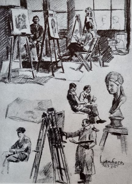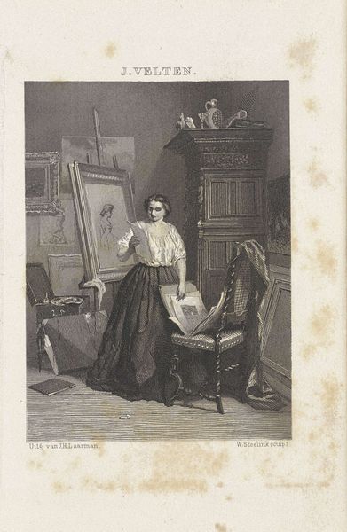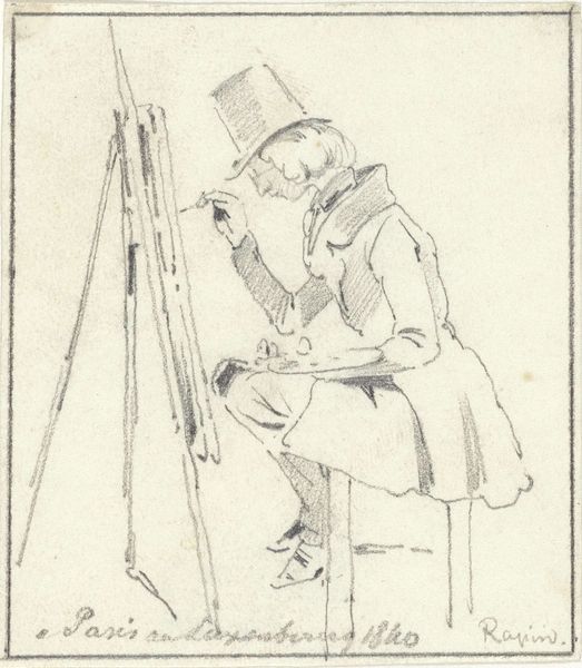 This image, "Schilderes voor haar ezel," or "Painter at her Easel," captures an artist from behind as she works. Camille Chenou Levesque used watercolor and graphite to create this piece, materials traditionally associated with sketching and preparatory studies rather than finished artworks. Look closely, and you can see how the fluidity of the watercolor allows for soft gradations of tone, creating a sense of light and atmosphere. The graphite adds definition, particularly in the details of the chair and easel. The quick, almost gestural strokes suggest a focus on capturing a fleeting moment of artistic creation. What's fascinating is the subject itself: an artist at work. It draws our attention to the act of making, the labor and focus involved in creating art. The choice of humble materials reinforces this idea, emphasizing the process over the preciousness of the final product. It reminds us that art is not just about the finished object, but about the work, skill, and creative energy that goes into it.