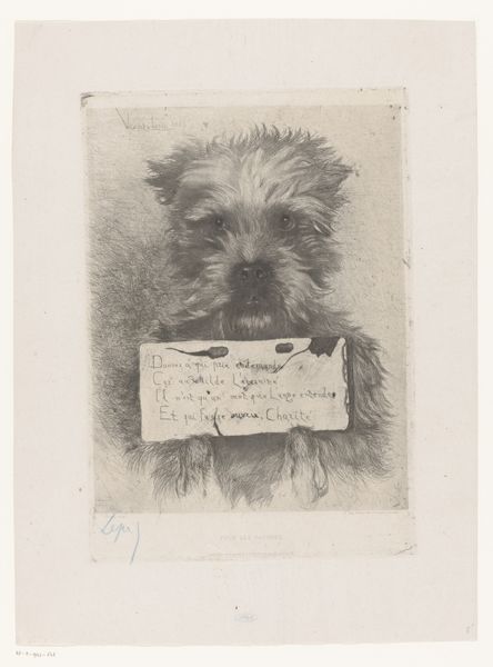 Editor: Here we have "Hondenkop," or "Dog Head," an etching by Florimond Buyck, made sometime between 1870 and 1909. It's incredibly detailed, capturing so much texture in the dog's fur. What do you see in this piece? Curator: From a formalist perspective, the power of this print lies in the contrasting textures achieved through etching. Notice the tight, almost frantic lines used to depict the fur around the dog’s face, creating a tangible sense of volume and roughness. Editor: Yes, it’s almost sculptural. Curator: Precisely. Then, observe the relative smoothness of the background. This contrast isn't just descriptive; it emphasizes the animal's presence, pulling it forward. How does the composition contribute to the work? Editor: I think the close-up framing, just the head and shoulders, isolates the subject and focuses our attention. Curator: Indeed. By cropping the subject so tightly, Buyck directs our gaze to the dog's features, enabling an in-depth study of its gaze and physiognomy. The success hinges upon Buyck’s technical mastery and close visual observations, achieving a likeness which feels startlingly intimate. The stark contrast emphasizes depth within a relatively shallow plane. The print offers visual depth in the material and textural differences. Editor: It's amazing how much emotion is conveyed through those technical choices, capturing the individuality of this animal. Curator: Absolutely. And it speaks volumes about the capabilities of etching as a medium, manipulating light and shadow. Editor: I never would have noticed that without you pointing out how it uses the contrasts to pop out. Curator: Attending to the formal components can unveil artistic choices we may initially overlook.