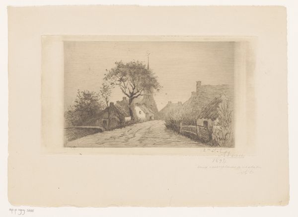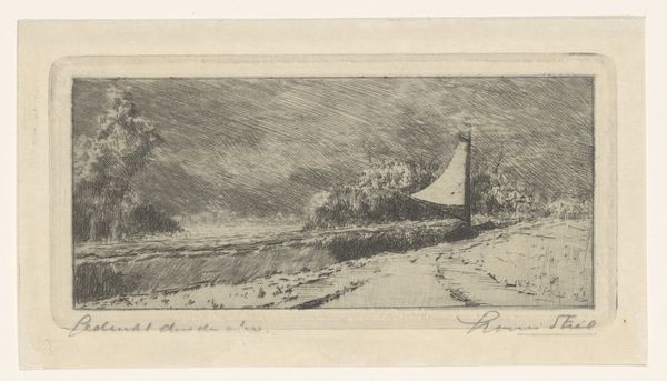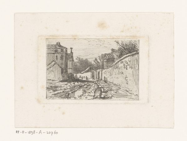 Léon Dolez created this print, "Spoorwegtoegang van de stad Mons," using etching techniques, resulting in a composition dominated by linear precision and textural contrast. The architectural elements are sharply defined against softer, atmospheric areas. The overall impression is a structured yet permeable space. Dolez uses line to delineate form, emphasizing the stark geometry of the city's fortifications and the railway entrance. The contrast between the textured surfaces of the stone walls and the smoother water creates a sense of depth and materiality. This play of textures and lines functions semiotically, invoking a dialogue between permanence and fluidity, structure and nature. The artwork also highlights the intersection of modernity with historical architecture, subtly destabilizing conventional representations of urban space. The varying line weights and tonal contrasts in the print guide our eye through the composition, framing the railway as both an entry point and a division. This invites us to consider the relationship between the viewer and the viewed, the insider and the outsider, suggesting that the artwork is less a static image and more a dynamic field of visual and conceptual interplay.