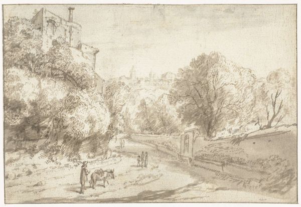 Jan Lievens created this ink drawing titled "Dorfansicht, rechts eine alte Stadtmauer" or "Village View with an Old City Wall on the Right" using brown ink. Lievens masterfully uses line and form to guide our eye through a Dutch village, where the architecture becomes a character in itself. Observe how the old city wall on the right, with its crumbling tower and archway, contrasts with the simple, angular structures of the houses on the left. The use of perspective invites us into the scene, placing us on the path alongside the figures dotted throughout. What's remarkable is how Lievens employs the sepia ink, to create depth and texture. The strokes vary from fine, detailed lines to broad, suggestive washes, bringing a sense of volume and decay to the scene. This technique not only enhances the visual appeal but also enriches our understanding of the painting. The composition reflects a structured yet dynamic relationship between nature and architecture. It portrays how forms in landscape painting become a means of expression, inviting us to look closer.