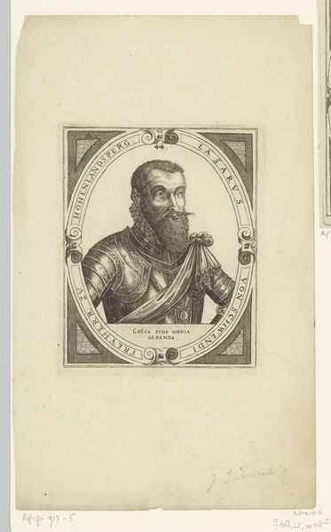 Editor: This is Elias Widemann's 1651 engraving, "Portret van László Fekete," housed at the Rijksmuseum. It's a striking portrait; the detail is incredible for an engraving. I’m particularly interested in its framing, with those little cracked corners and Latin inscriptions. What historical insights can you glean from this work? Curator: This portrait presents an interesting glimpse into the world of 17th-century Central Europe and its complicated relationships with political power. It seems to be depicting László Fekete, and, crucially, his societal role, which is reinforced by the visual language around the image itself. How do you think the Latin inscriptions function in this context? Editor: I imagine the Latin inscriptions lent the image an air of prestige and sophistication, but also made it exclusive to certain groups. Curator: Precisely. In this period, portrait engravings like this were often commissioned to commemorate individuals and disseminate their image, especially within political or academic circles. Notice the phrases "VICE CAPITANEVS," referring to his position as Vice Captain and "S.C.R.M" implying nobility. This tells us about the subject’s social standing and how they wanted to be perceived. Editor: So the visual language helps to construct a specific image of power and authority. It also speaks to how portraits were functioning socially. Curator: Exactly. Also, note how printmaking technology enabled wider dissemination, it served as a tool for constructing and reinforcing social hierarchies. Considering the time period, do you have any immediate ideas as to *why* an image of someone with Fekete’s titles would need distributing? Editor: I suppose with Europe’s shifting geopolitical situation, this engraving could’ve helped project strength amid conflict. What do you take away from this artwork? Curator: Understanding the historical context illuminates the intentionality behind the creation and circulation. For me, it highlights the intersection of art, power, and social identity in the 17th century, revealing the careful construction of public image. Editor: This gives me a completely new way to think about portraits; I’ll never see them the same way.