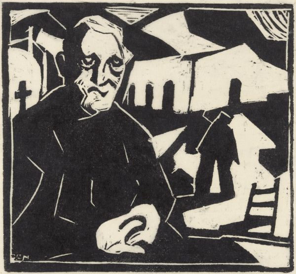 Editor: We are looking at Louis Cardinaals' "Voorbijgangers," or "Passersby," a woodcut print from 1931. It feels very stark, almost severe in its contrasts. What stylistic choices stand out to you, Professor? Curator: Observe how the artist uses stark contrasts in black and white. Note the heavily outlined forms and the angularity of the shapes. These elements, devoid of nuance in shading, contribute to the emotionally charged expressionistic style, with an echo of German Expressionist printmaking, don't you agree? Editor: Absolutely, that boldness creates a definite mood! I am particularly intrigued by the faces; their exaggerated features suggest caricature. How does that stylistic choice shape the overall message? Curator: The exaggerated features are, indeed, deliberate. Focus on how line and form distort conventional portraiture. This technique underscores a modernist commentary, prioritizing subjective experience over objective representation. The coarseness of the woodcut emphasizes the lack of refinement in what he is representing; notice the recurring angular shapes and simplified forms of their clothing, rendering the 'passersby' as types. Do you see how the use of the formal elements conveys its themes? Editor: I see it now. By distorting the figures, he shifts our attention from individual identities to broader types, prompting a formal commentary on society and its types through expressive mark making. Curator: Precisely. By employing distortion of line, shape, and surface qualities, it achieves that powerful social observation and artistic autonomy that interests us in modern works of art. Editor: That focus on form has certainly reshaped my view of the piece and how those components function together to reveal such intriguing layers! Curator: Agreed. Understanding formal elements unveils how artistic choices drive not just aesthetics but the artwork’s expressive potential.
