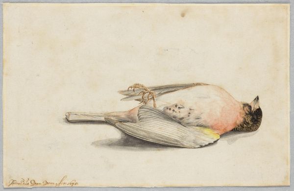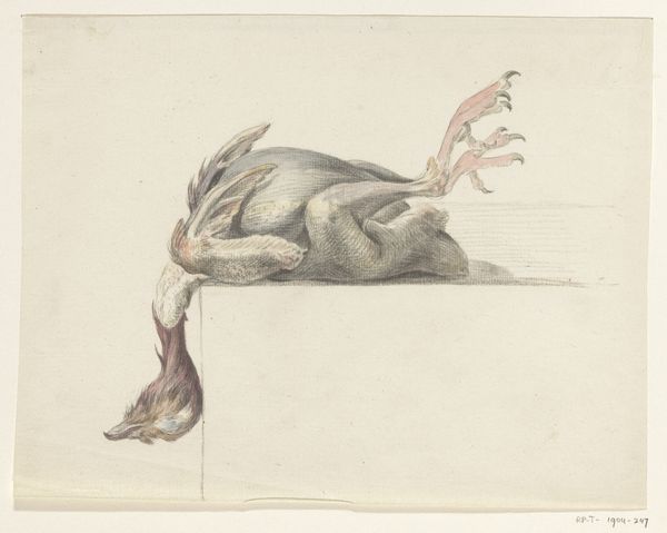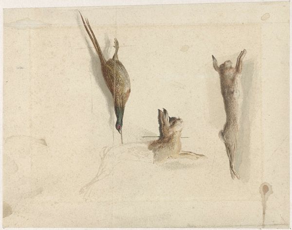 Editor: Here we have "Dead Birds," a watercolor and pencil drawing by Count Giorgio Duranti, dating from between 1685 and 1755. The overlapping birds create an intriguing composition. The stillness of the scene is what I noticed first. How do you interpret the arrangement of the birds and the use of line and color here? Curator: Note the formal elements. The artist employs a restrained palette, predominantly utilizing earth tones and subtle grays. The interplay of light and shadow is adept, rendering the textures of the feathers with considerable detail, wouldn't you agree? It accentuates their physical presence, despite their lifeless state. Editor: I do agree! It’s quite detailed, yet subtle. So, what about the composition? Is there a specific structure? Curator: Observe how the birds are arranged in a somewhat haphazard manner, creating a pyramidal composition, though off-center. The overlapping of forms creates depth, albeit within a shallow pictorial space. The lines are precise, descriptive even. How does this contribute to the overall impact of the work, in your estimation? Editor: I think it forces us to consider them as specimens almost, but the soft colors stop it from becoming clinical. There's a delicate balance. Curator: Precisely. The drawing exists in a curious space between scientific observation and artistic expression. We see Duranti's deft manipulation of visual components: tone, line and shape working together to create an impactful study. Editor: That makes me see the piece in a whole new way, as both technical and artful. Thanks! Curator: My pleasure! It’s through such dialogues we refine our comprehension.