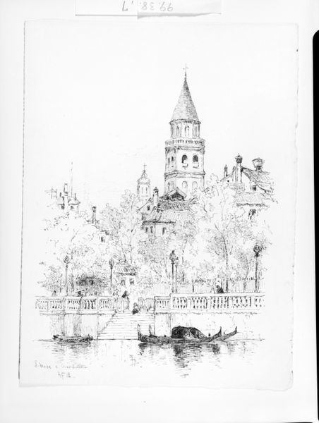 Curator: Here we have Andrew Fisher Bunner's "San Michaeli and Murano, Venice," created in 1883. It's a pen and ink drawing on paper currently residing here at the Metropolitan Museum of Art. Editor: Immediately, I'm struck by the shimmering, almost dreamlike quality achieved through such precise linework. It captures the watery essence of Venice beautifully, doesn’t it? Curator: Bunner certainly understood how to evoke atmosphere. He was part of a wave of American artists who flocked to Europe in the late 19th century, drawn to the artistic and cultural richness, specifically, the allure of Venice. This piece showcases the architecture, yes, but equally the vital presence of its lagoon setting. Editor: The architectural details are fascinating, a kind of language spoken by the buildings, the bell tower. Look how that dome shape repeats throughout. Is that echoing of the Byzantine influence? I sense both earthly presence and an upward, spiritual reaching in its overall form. Curator: Exactly. San Michele, of course, served for centuries as Venice's cemetery island. The visual emphasis, as you've keenly observed, pulls together religious and civic spaces. These sites held real political weight, serving not only the doges, the merchants, but also Venice’s collective identity. Death shaped much of Venice's reality. Editor: It gives a completely different layer to those gentle reflections on the water – like they are carrying countless stories of loss, of lives once fully present on those very islands. Are the trees framing that bell tower specifically important? I think nature contrasts the architecture here. Curator: Perhaps, given the setting, there is an allusion to the cycle of life and decay inherent in the Venetian lagoon system. Nature pushing against architecture. Ultimately this would underscore Venice's vulnerability as a human-made marvel. This speaks to ongoing challenges concerning climate change and historic preservation. Editor: Yes, so many histories contained in one relatively simple drawing, but all the imagery connects into something that reflects a wider memory of the world, doesn’t it? Curator: Absolutely, I believe this piece can offer a window into how Venice has been, continues to be, framed as a unique location politically, socially, environmentally, even existentially. Editor: Beautifully said. The drawing's enduring quality is in its layers of meaning that continue resonating through both architecture and imagery.