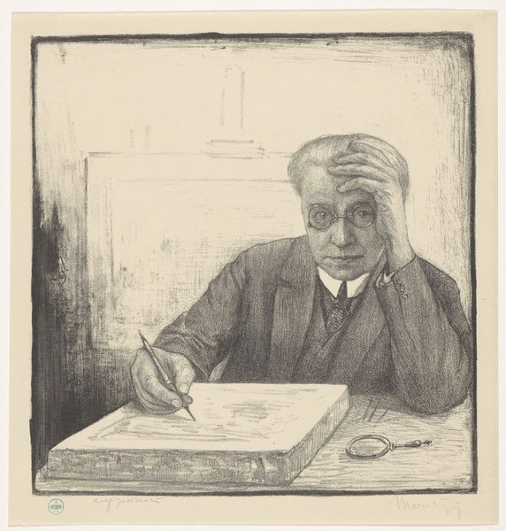 Editor: Right now we’re looking at Louise Danse’s etching "Auguste Danse aan het etsen," made sometime between 1877 and 1909. The piece seems really intimate, doesn't it? There's a solitary figure hunched over his work, maybe even struggling with it, and it makes me wonder: What do you see in this piece? Curator: Oh, it's pure immersion, isn't it? It makes me think about the almost monastic dedication needed to create art. The bottle there hints at inspiration...or perhaps, just long hours. The artist here, presumably Auguste, looks absolutely absorbed, lost in the minute details that transform ordinary scenes into art. Louise, in capturing him, seems to be whispering, "Look, here’s the secret: presence.” Does it make you think about that constant struggle between observation and interpretation, or the way artists see the world? Editor: It definitely does! I love how you call it "pure immersion." Now I’m picturing him so focused he’s barely breathing, and everyone, including his sister, might be interrupting him. Curator: Absolutely, maybe even that intense focus is the art, right? Have you ever felt that deep? The whole world melts away, you’re only existing as the pen on paper? That space there – a world in itself. Editor: Now I'm thinking about how difficult etching must be. Louise really captured that sense of meticulousness in the work. It has really opened my eyes. Curator: Absolutely! Perhaps now you can appreciate the skill and intention that goes into capturing it in art. It's not just technique; it is something beyond that the artist captures and turns into an artwork for us.