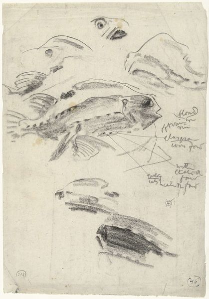 Editor: Here we have Gerrit Willem Dijsselhof's "Detailstudies van vissen, met kleurnotities," dating from sometime between 1876 and 1924. It's a pencil and ink drawing. It almost looks like a page torn from a scientific notebook, yet the varying perspectives and annotations lend it an artistic, exploratory feel. What jumps out at you? Curator: The immediate visual impact resides in the dynamism of the composition. Note the clustered arrangement, devoid of a conventional focal point. Dijsselhof orchestrates a field of visual information, a network of lines and tonal variations. Observe the strategic use of hatching and cross-hatching. Where do you see that? Editor: I see the cross-hatching, especially defining the forms and the shading around the larger fish towards the upper-left. It gives the drawing depth despite being primarily lines. What does it tell us about his method? Curator: Precisely. These techniques do more than merely represent form; they create a sense of movement and volume on a two-dimensional surface. This emphasizes the surface quality of the paper. Dijsselhof seems particularly interested in the raw, unmediated quality of the materials. Are the color notations actually helpful? Editor: Honestly, not particularly helpful by themselves since I cannot read them, but I suspect that wasn't the sole intention. More like part of a process to connect what he sees and how he translates that through mark making. I hadn't considered that the immediacy, but now I do! Curator: Precisely. We observe the artist in media res. The drawing's value is less about an external subject, and more about investigating the act of observing and documenting. It becomes less about accurate depiction, and more about an intellectual record and process. Editor: So, focusing less on WHAT is being drawn, and more on HOW the drawing itself conveys meaning. That makes so much sense! Curator: Indeed. Art becomes an experience registered as marks and forms, less concerned with perfect representation than it is with exploring line, texture, and form in and of themselves.