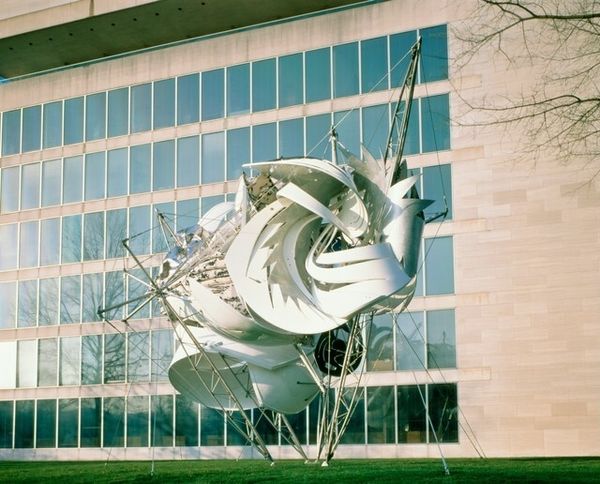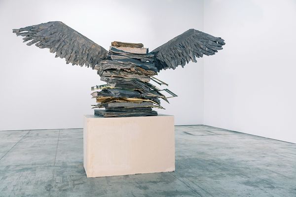 Curator: Standing before us is Anselm Kiefer's "Uraeus," a public sculpture dating from 2018. It's crafted from metal, appearing rather imposing within this urban setting. What's your immediate take on it? Editor: Heavy. Weighty. It feels like the last chapter of something epic. Like a fallen angel with a lot on its mind—and now its feathers and books are scattered. It's brooding, isn't it? Curator: The juxtaposition is interesting, wouldn’t you agree? The raw, almost brutal quality of the metal against the classic backdrop of Rockefeller Center…Kiefer often explores themes of history, memory, and mythology. Editor: Mythology, yes! That staff with the serpent—classic symbol. But I get more post-apocalyptic vibes here. Maybe it’s about the weight of history crushing us, not elevating us? I mean, those books aren’t just sitting there, they’re kind of…splattered. Curator: Perhaps both are true. Kiefer's work doesn’t offer easy answers. "Uraeus," referring to the ancient Egyptian cobra symbol of divinity and royalty, raises questions about power, knowledge, and the consequences of both. It’s literally a fallen open book with giant metal wings. Editor: Right. The title throws this extra layer in: knowledge and divinity brought down to earth. Almost literally grounded. So, where do we find the sacred now? Amongst the ruins of old stories and power structures? The artist poses profound, discomforting questions. I find it visually jarring and deeply thoughtful at the same time. Curator: Precisely, the sculpture invites reflection on how societies build themselves and how knowledge either soars or is grounded, becoming scattered amongst the landscape and our conscious mind. It's definitely intended as something to stop you in your tracks. Editor: Absolutely. It sticks with you; I will certainly remember passing it today, thinking how lucky this location is for installing something so interesting to see and think about.