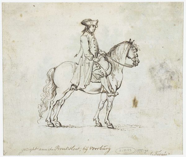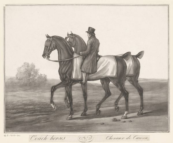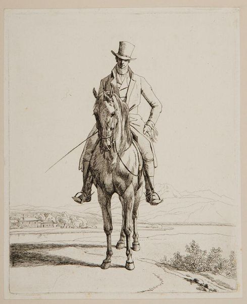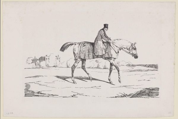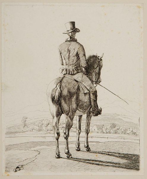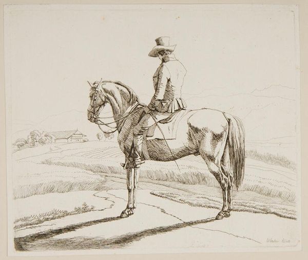 Curator: The etching "Horsemen (6)" is by Wilhelm von Kobell, a German artist born in 1766. The print is held in the collection of the Harvard Art Museums. Editor: It has a sort of quiet, almost melancholic feel to it. The rider seems self-contained, perhaps a little aloof. Curator: That reflects a rising class in society, particularly after the Napoleonic wars, where equestrian portraits became symbols of status and authority. They also hint at the influence of the military. Editor: Yes, the man's attire certainly suggests a connection to military aesthetics. More broadly, the horse itself is a potent symbol. The horse embodies nobility and controlled power. Curator: And the background, though minimal, suggests land ownership and social standing. These prints would have circulated amongst a specific class of people. Editor: I see it now—a subtle statement about belonging, rendered with exquisite detail. Curator: Indeed, Kobell captured a moment in history and a change in social dynamics.