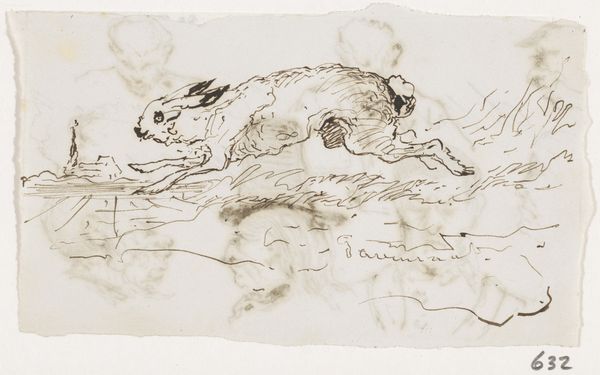 Curator: Immediately, I feel its urgency. A burst of movement captured in a few strokes. Editor: This lively drawing, known as "Haas," which is Dutch for "Hare", was crafted with ink on paper sometime in the 1860s. The artwork finds its home at the Rijksmuseum. It’s attributed to Johannes Tavenraat. Curator: There's such economy in the lines, just enough to suggest form and frantic energy. It's more gesture than a portrait. A very direct reaction to seeing an animal spring into motion, don't you think? Editor: It is economical. Consider the availability and cost of materials during that era. Ink and paper, while more accessible than canvas and paint, were still commodities. Tavenraat's rapid sketch suggests a certain practicality, perhaps driven by the need to capture the subject efficiently and prepare it to other processes, for reproduction through etching, or further studies. Curator: That’s a fascinating point. Looking at the quick, almost scribbled lines defining the rabbit's fur and muscles, you do get a sense of something produced for practical use. It lacks a certain level of refinement of high art in pursuit of another purpose. Did Tavenraat explore printmaking himself? Editor: He primarily focused on drawing and painting. But this work raises questions about how artistic skills were applied in other industries or reproduced to reach new audiences. This was an increasingly industrial world after all, in constant need of fast information and visual knowledge. Curator: I appreciate the contrast it highlights – between capturing an instant and situating artistic creation within the machinery of image production and consumption. Now, whenever I see it, I won't just see a fleeting glimpse of nature, but also the wheels turning in a broader historical machine. Editor: Precisely. The rabbit runs across the paper, leaving trails in the collective conscience that linger on production and creation itself.