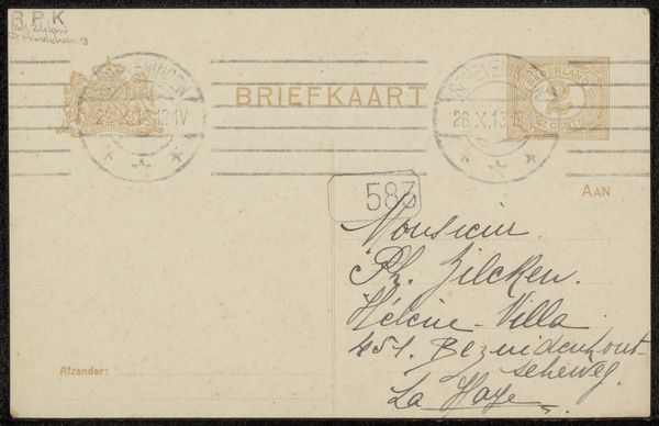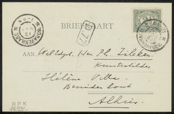 This is an undated postcard to Philip Zilcken by Gerardus Johannes Roermeester. It is a compelling study of how mundane objects participate in the semiotic play of daily life. The postcard's design orchestrates several structural elements to create a cohesive, communicative surface. Note how the lines, stamps, and handwriting aren’t merely functional. Instead, they serve as aesthetic components in the composition. The careful arrangement of each element, from the placement of the stamps to the calligraphic script, transforms this into a tableau of texture and tone. Consider how the postal markings—the imprints of time and transit—become integral to the postcard’s identity. They challenge fixed meanings and suggest that even the most functional objects carry layers of cultural and personal information. It invites us to see beyond the surface and decode the myriad messages embedded within.