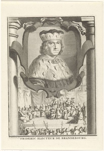 Editor: So, here we have Jacob Houbraken’s 1724 engraving, "Portret van François Valentijn," currently residing at the Rijksmuseum. It’s a rather imposing portrait, quite Baroque in its flair, yet… I'm struck by this somewhat staged quality. What do you make of this piece? Curator: Ah, yes, François Valentijn, quite the character. But before we talk about the man, have you considered the theatrical framing? Figures from the East seem to literally hold his image up! It feels less like a straightforward portrait and more like… a hagiography, wouldn’t you say? Editor: A hagiography! Like it's illustrating his life as a saint. The non-Western figures really emphasize the "exotic." Curator: Precisely. Valentijn was a minister and naturalist, but more famously known for his, shall we say, "extensive" writings on the Dutch East Indies. These images position him as a man surrounded by his, let's call them "domains" and the inhabitants that resided there. A figure presiding over different parts of the world in the spirit of exploration. It certainly offers an interesting insight into the Dutch perspective of that era, don’t you think? Editor: Definitely. So, it’s less about capturing his likeness and more about portraying him as this all-knowing figure, a master of his domain. Kind of changes the whole feel of it. Thanks! Curator: My pleasure! It's a reminder that portraits aren't always simple reflections; sometimes they're elaborate stages for crafting a narrative. The key is recognizing those theatrical cues!