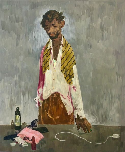 Curator: This is "The Bar on East 13th Street" by Salman Toor, completed in 2019 using oil paint. What strikes you most when you first look at it? Editor: The overwhelming green palette! It drenches the entire scene, giving it an almost dreamlike, slightly sickly quality. It’s a strangely compelling choice, considering the potentially seedy setting. Curator: Indeed. The monochrome effect certainly pushes us to think about the atmosphere and perhaps the characters within it. Toor's work often explores themes of identity and belonging, particularly within queer and diasporic communities. How might this painting speak to those themes? Editor: The bar setting itself is significant. Bars have historically been vital social spaces, particularly for marginalized groups. Look at how he renders the scene – almost a stage set – filled with people. Are they looking for connection, escape, or simply a sense of community within that green wash? The almost naive brushwork contributes to the reading of this painting as from memory, or as imagined. The bottle details aren't really readable as specific liquors, the painting as a material object has allowed for so many potential scenarios here. Curator: Absolutely. And notice the nuanced ways Toor captures his subjects’ emotions – a sense of yearning or quiet observation. This piece evokes the weight of navigating complex identities in the urban landscape. Think about the title too, “The Bar on East 13th Street”. The specificity of the place grounds it but simultaneously broadens its implications. East 13th Street could be any East 13th Street anywhere really. It's the materiality of this specific, or maybe any, place in time. Editor: There’s a beautiful tension between the specificity of the title and the universality of the emotions. Even the textures—the oil paint creating this tangible sense of layered space– contribute. It is the everyday rendered through the artists' memories, feelings, the production that matters and speaks in paint, not in perfect depictions, a capturing of lived material moments. Curator: I agree entirely. It invites the viewer to participate in those complex dynamics. Editor: This look into materials and production techniques as capturing feeling provides us, as the viewer, the key. Curator: Exactly, it leaves us contemplating the intersections of queer identity, social spaces, and individual experience. Editor: And perhaps, reflects back to us the conditions by which we can see ourselves as reflected through paint.