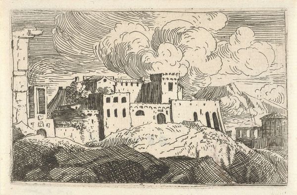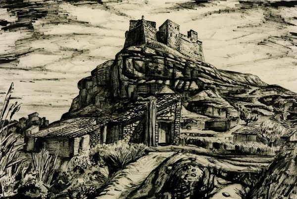 Editor: Here we have Kakabadzé’s "Svaneti," created in 1939 using watercolor. I'm immediately struck by the looming, almost oppressive sky, contrasting sharply with the clustered buildings. What is your interpretation of the artist's perspective here? Curator: Kakabadzé painted "Svaneti" during a politically tumultuous time in the Soviet Union. The depiction of the Svaneti region, known for its isolated, defensive towers, raises interesting questions about power, control, and cultural identity during the Stalinist era. Editor: In what way? Curator: The architecture itself embodies a resistance, built for defense and existing outside centralized control. Consider the socio-political implications of an artist focusing on such a locale at that time. Could this be a subtle commentary on the push for homogenization within the Soviet state? The dramatic clouds also evoke an emotional tone of unrest, don’t you think? Editor: I see what you mean. The heavy clouds and stark towers could symbolize resistance and perhaps even the weight of the state bearing down on individual cultures. What role did art institutions play in shaping these interpretations? Curator: The official Soviet art was Socialist Realism. The work we see here would certainly be at odds with what the regime was advocating for at the time. It wasn't simply about aesthetics; it was about allegiance. So Kakabadzé here could also be pushing against the public perception of art during this time period. Editor: This gives me so much to think about in terms of how artistic choices can reflect, or even resist, the political climate. Thank you for shedding light on those deeper connections! Curator: Indeed! Art's role in shaping and reflecting the socio-political context is powerful, something that becomes particularly evident under periods of political constraint.