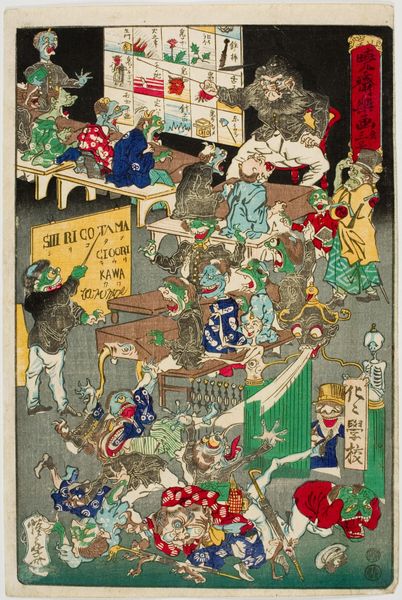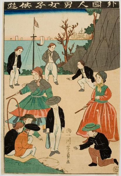 Curator: I find the flat planes of color so striking, and how Yoshitora creates depth through layering and perspective is quite sophisticated. Editor: This is Utagawa Yoshitora's woodblock print, "View of the Amusements of the Foreigners in Yokohama, Bushu," now residing at the Harvard Art Museums. It certainly gives a glimpse into a specific historical moment. Curator: It feels crowded, doesn't it? So many distinct groups, each occupying their own space, creating a visual hierarchy. Is it a fair representation of this time? Editor: As a commercial print, its function was likely to entertain and inform the Japanese public about the influx of foreigners and their activities in Yokohama. The figures and the setting undoubtedly carry complex political symbolism. Curator: I wonder about the people depicted. Are they actually observing a theater performance, or is the artist showing off a spectacle for the Japanese viewers? Editor: Well, the visual structure itself invites us to ponder the relationships between observers and observed in a rapidly changing society. Curator: A fascinating intersection of aesthetics and cultural commentary. Editor: Indeed, it gives insight into cross-cultural interactions during the late Edo period.