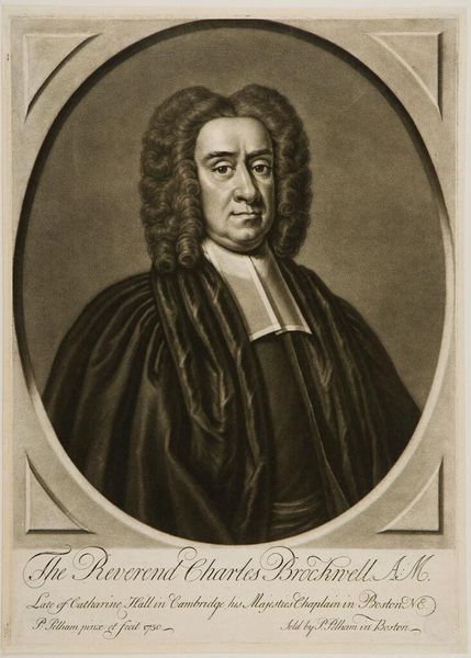 Editor: Here we have John Singleton Copley's portrait of "The Reverend William Welsteed." It’s a somber work, a man framed in an oval, with lots of text at the bottom. What symbols do you notice in this piece? Curator: The oval itself is symbolic, representing wholeness and containment. The meticulous lettering below speaks to the importance of recording and disseminating information, but also the weight of societal expectations. Editor: Expectations? Curator: Yes, consider the man's clerical collar and formal attire. These are not merely descriptive details but carefully constructed symbols of his role and authority within the community. He is meant to be read as a figure of moral and intellectual authority. Editor: So, every element contributes to how we understand his position. I hadn’t thought about it that way. Curator: Exactly. And it reveals how much cultural messaging can be packed into a single image.