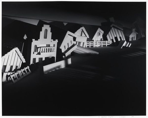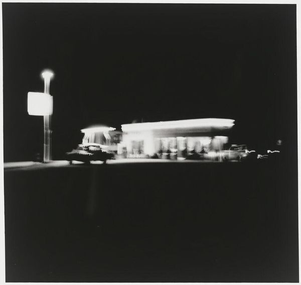 Editor: We’re looking at “Moulin Rouge, Paris,” a photograph taken around 1929 by Germaine Krull. It's a monochrome image, and there's something dreamy, almost ghostly, about how Krull captured the whirling lights of the cabaret and what appears to be an amusement ride. It makes me think of a memory, hazy but full of energy. What do you see in this piece? Curator: Oh, this takes me back! Krull, you know, was quite the radical. What I see here is a symphony of light and motion. Those whirling windmills – not just the literal one, but the feeling of constant movement. To me, it’s less about Paris as a location and more about Paris as a state of mind – chaotic, exciting, and relentlessly modern. It’s that post-war buzz, all energy and experimentation. Do you sense that frantic energy as well? Editor: I do. Especially with the blurred car moving through the scene. It seems that everyone and everything is always going! I see some suggestions that Krull may have been associated with art deco or modernism; does that influence the photograph for you? Curator: Absolutely! Modernism was all about breaking away from the old, embracing the new, even if it was a little rough around the edges. And Art Deco added that layer of glamour and machine-age aesthetics. She plays with this push and pull. Look how she’s composed the shot – that dynamic perspective, almost like you're thrown into the middle of the action. She’s not just showing us the Moulin Rouge; she's giving us a taste of the era. It's very sensory, and a bit overwhelming. A feeling that translates surprisingly well nearly one-hundred years later! What's your feeling about the image overall? Editor: Well, before I was looking at the photograph; now, after our talk, it feels like I'm there! It's interesting that by showing this one little block in the city, Krull also shows that moment in time. Thanks! Curator: My pleasure! It’s images like this that remind us that art isn't just about pretty pictures; it’s about capturing the soul of a moment. It is also so pleasing when a moment comes alive and gives me new life.