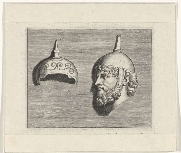 Curator: Look at this striking Baroque etching, "Head of a Man with Plumed Helmet," created in 1645 by Wenceslaus Hollar. It resides in the esteemed Rijksmuseum. Editor: The texture! All those finely etched lines give it a powerful gravitas, almost intimidating. There is something about the plume, too, both delicate and proud. What could such armor communicate in this period? Curator: Helmets like this are laden with symbolic power. They represent not only military might but also status, wealth, and lineage. The elaborate design becomes a visual marker of identity within a strict social hierarchy. Editor: So, essentially, it is a display of power, like a walking billboard of authority? Were such pieces strictly ornamental, or would they be put to practical use on the battlefield? Curator: The etchings suggest this might be based on parade armor, emphasizing display more than combat. It is unlikely he would face actual conflict with something so meticulously crafted. The plume would surely obscure one's vision. Hollar seems more concerned with the ideal of the warrior. What do you think of how armor functioned in public spectacle at the time? Editor: In the 17th century, armor symbolized more than just personal protection, becoming inextricably linked with courtly display. Such elaborate gear broadcast power. The symbolic weight overshadows pure practicality, as seen in how rulers employed fashion and material culture for maintaining societal hierarchy. Curator: The artist’s skill here makes this more than just a study of armor; it captures a certain type of self-assured masculinity of the time. The subject exudes confidence bordering on arrogance. How do you view the face itself, independent from the helmet? Editor: He's a study in contradictions. The beard and face speak of age and experience, maybe hardship. But there is a stillness and intensity that belies something else. His character comes through despite being somewhat masked by all that armor. Curator: Absolutely. Hollar gives us a tantalizing glimpse of the man beneath the metal, reminding us that symbols, no matter how imposing, are ultimately worn by individuals with their own complex stories. Editor: This print gives voice to its time period, doesn’t it? A potent blend of military prowess and artistic flair, crafted right amid immense social shifts.