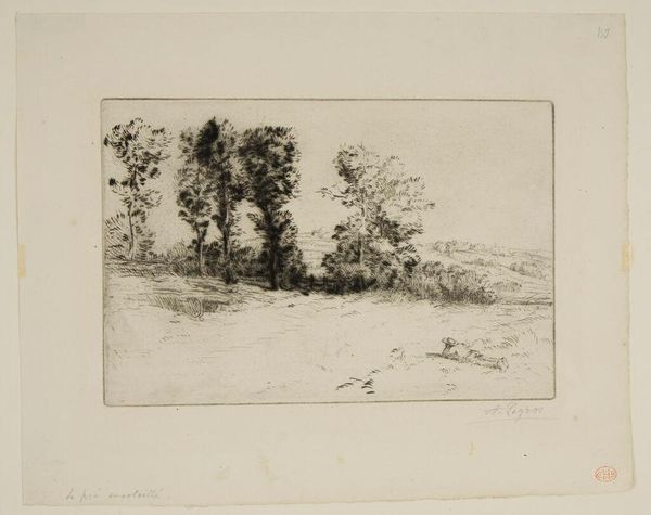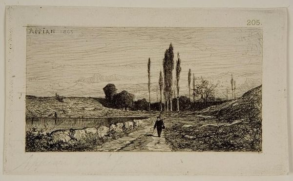 Curator: This is Auguste-Louis Lepère's "La route de la Houssoye", held here at the Harvard Art Museums. It immediately strikes me as rather bleak, almost desolate. Editor: The contrast between light and shadow definitely sets a somber mood, especially with that empty road dominating the foreground. I wonder if Lepère meant to invoke feelings of isolation. Curator: It's crucial to consider Lepère's engagement with rural life and the art world of his time. Was he reflecting on socio-economic shifts or perhaps idealizing the countryside? Editor: Maybe both? I see the road as a metaphor for societal progress, but its rough condition highlights the inherent challenges, even oppression faced by rural communities. Curator: That’s a valid point. The composition, with its deliberate emphasis on texture, invites viewers to confront the harsh realities of this landscape and its people. Editor: Yes, and perhaps it asks us to question our own positionality in relation to such landscapes and the narratives we construct around them. Curator: This print offers a lens into a specific moment in history, prompting us to think critically about the forces at play. Editor: Absolutely, it's a starting point for understanding art’s potential for social commentary and reflection.