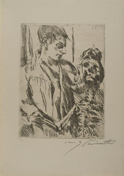 Editor: This is "Death and the Old Man" by Lovis Corinth, a haunting etching. It feels incredibly raw and personal. What’s your interpretation? Curator: Well, historically, the "Dance of Death" motif was a popular reminder of mortality, often commenting on social hierarchies. Corinth, however, seems to internalize it. Editor: Internalize it? How so? Curator: Notice the stark contrast and the rough lines. It's less a societal critique and more an intimate portrayal of aging and confrontation with one's own mortality, reflecting the anxieties of early 20th-century Europe. Editor: That's a fascinating point. I hadn't considered the personal anxiety aspect. Curator: The print medium itself, allowing for wider distribution, puts mortality in the public sphere, yet retains a profoundly individual quality. It encourages us to reflect on our relationship with death. Editor: I see what you mean! This gives me a lot to consider.