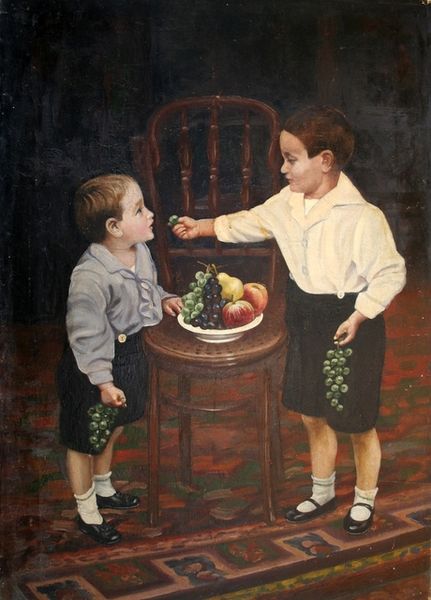 Editor: So, this painting is called "Glaces du jour" by Victor Gabriel Gilbert. It seems to be an oil painting, possibly from the late 19th century. I am struck by the carefree mood that reminds me of summers spent playing outside. How do you interpret this work? Curator: It’s interesting you pick up on the "carefree mood." Let's consider the historical context. The painting depicts two young girls enjoying ice cream in what appears to be a public park in Paris. Now, what does the presence of these children in a carefully maintained public space suggest about the role of public life in late 19th-century French society? Editor: Hmm, maybe it reflects an increasing emphasis on childhood and leisure time for certain classes. Curator: Precisely. The painting subtly acknowledges class divisions too. Consider their clothing, and the availability of "glaces"—ice cream was becoming more accessible but certainly not ubiquitous for all Parisians. What kind of values might paintings like this reflect or promote about childhood, consumerism and access to public resources? Editor: It kind of feels like it's celebrating a new, more open and child-friendly vision of the city. However, like you said, access might be a little restricted. The city, especially in artwork, sometimes functions as a showcase. It kind of leaves a bitter sweet feeling... Curator: Yes, that's well observed. Artists like Gilbert were complicit to painting this 'beautiful world', omitting its shadows and the life struggles happening elsewhere. So while aesthetically pleasing, we can also examine these works critically, as tools for societal reinforcement. It makes one question whose experiences get validated, or get to have space in the visual sphere, right? Editor: Definitely. I hadn’t considered it in that way before. Thinking about its function in its time…it's a new, fascinating approach for me to evaluate art. Thank you for highlighting that crucial societal component to unpack.