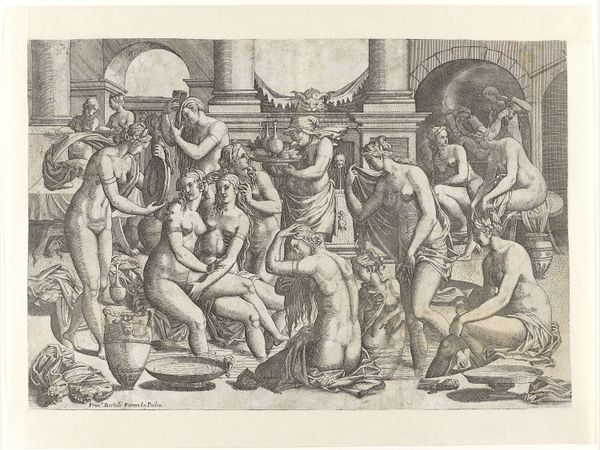Curator: Immediately, I notice the texture. It's like a whisper of lines forming a world, quite delicate, really. Editor: This is “Actaeon wordt vervloekt door de badende Diana,” or "Actaeon Cursed by the Bathing Diana," an engraving crafted between 1600 and 1620 by Justus Sadeler. You can find this baroque depiction currently housed in the Rijksmuseum. It illustrates the myth of Actaeon, a hunter who stumbled upon Diana, the goddess of the hunt, bathing with her nymphs. Curator: Poor chap. Always a bad idea to walk in on someone when they're feeling vulnerable, especially when they're divine. Visually, the figures are so close together, a mass of bodies almost interwoven with the landscape, yet so separate in their expressions. There is a distinct lack of connection, and thus, harmony. Editor: Exactly. Actaeon's transgression wasn't simply about seeing Diana naked; it was a violation of boundaries, of power dynamics. His male gaze, imposed upon the female nude in a moment of private ritual, sparked a brutal consequence. The punishment for this intrusion was becoming prey. He was turned into a stag and hunted down by his own hounds, as this tale often goes. Curator: Ah, there is where your modern analysis, intersectional narrative of power, gender, and justice helps me appreciate a new way of observing it. From a purely artistic standpoint, I was just caught up in the technique – all those tiny, controlled lines creating such a chaotic scene! How each figure, while sharing the same space, occupies its little pocket of emotional reaction. There is even what seems to be indifference, even as one figure shields another's face as though covering their eyes to prevent them from having also seen something improper. Editor: Yes, and consider how Sadeler used this mythological scene to mirror broader societal structures and gender relations, creating something layered that provokes our deeper considerations. The art is both a reflection of power imbalances and an implicit social commentary about moral transgression and ultimate punishment. Curator: I must admit, this has really turned my reading around. I started by enjoying it but appreciating the technical artistry of it, but now, I will probably view it with considerations about boundaries, gaze, and power, whenever I pass by this engraving once more. Editor: And for me, viewing it through your perspective—I now better understand the brilliance required for translating the full extent of such grand thematic notions to something so refined and distilled as a collection of simple engravings.