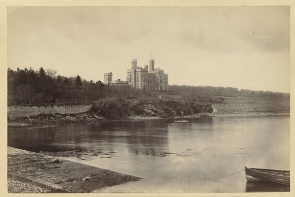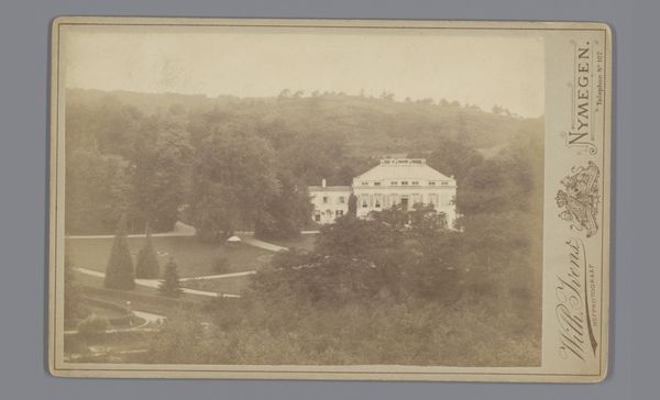 Curator: There’s something melancholy about this image. Almost dreamlike. It's making me feel lost in time somehow. Editor: I feel that, the sepia tones definitely contribute to that nostalgic, distant feeling. This is a gelatin-silver print from sometime between 1863 and 1873 titled, rather simply, "Gezicht op Windsor Castle" which translates to "View of Windsor Castle". What draws you into this view? Curator: Well, it's the framing, I think. The castle perched up there, almost ethereal, beyond the trees, and the path leading the eye in but then… nowhere, really. There's a deliberate stillness about it all. And is that people sitting in the distance on the left? Editor: Good eye. They're minute, aren’t they? Rendering the grand Windsor Castle accessible, part of the community—though always perched above them, in fairness. There's definitely a power dynamic suggested through placement. It subtly echoes how wealth and power are experienced by many, simultaneously part of life, but separate, unattainable even. Curator: Ah, always the power dynamics! I like how it gives this fairytale castle this underlying message of societal structure that isn't readily apparent. What is truly apparent is the almost hazy atmospheric conditions giving this photo what feels like more mystery and awe, like how myths are passed along through memory over time and distort to what they aren't with a golden haze of nostalgia. Editor: It also challenges romantic notions, right? The technology – gelatin-silver printing – would have allowed for wider distribution and consumption of royal imagery and ideas. Almost journalistic. Who gets to see and understand power? Curator: I appreciate how a singular shot gives such rich conversation. It certainly isn't your traditional shot. I love its haziness, a sort of dreamy, bygone quality that is very romantic indeed. Thanks for helping me put into words. Editor: Of course. The landscape format invites these questions; who gets to enter and claim public space, the stories landscapes hold and what’s hidden within the landscape itself. It has certainly been illuminating.