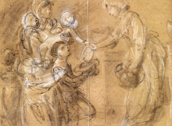 Adriaen van Ostade created this drawing, "Dancing Farmers," using pen and brown ink, rendering a lively scene with a focus on the materiality of everyday life. The monochromatic palette and the artist's fluid lines animate the composition, drawing us into the rustic setting. Notice how Ostade uses the structure of the composition to engage with the subject matter. The arrangement of figures around the central dancing couple creates a dynamic interplay between activity and observation. The careful attention to the textural qualities of the interior, from the rough-hewn beams to the earthy attire of the peasants, grounds the scene in a tangible reality. The drawing challenges idealized notions of pastoral life, offering a glimpse into the raw and unembellished existence of the working class. The choice of medium itself—pen and ink—emphasizes the immediacy and authenticity of the scene. Ostade seems to suggest that true beauty lies not in idealized forms but in the unpretentious and unfiltered aspects of everyday existence. Remember, the interpretation of art is an ongoing dialogue, inviting us to consider the multiple layers of meaning embedded within a work.